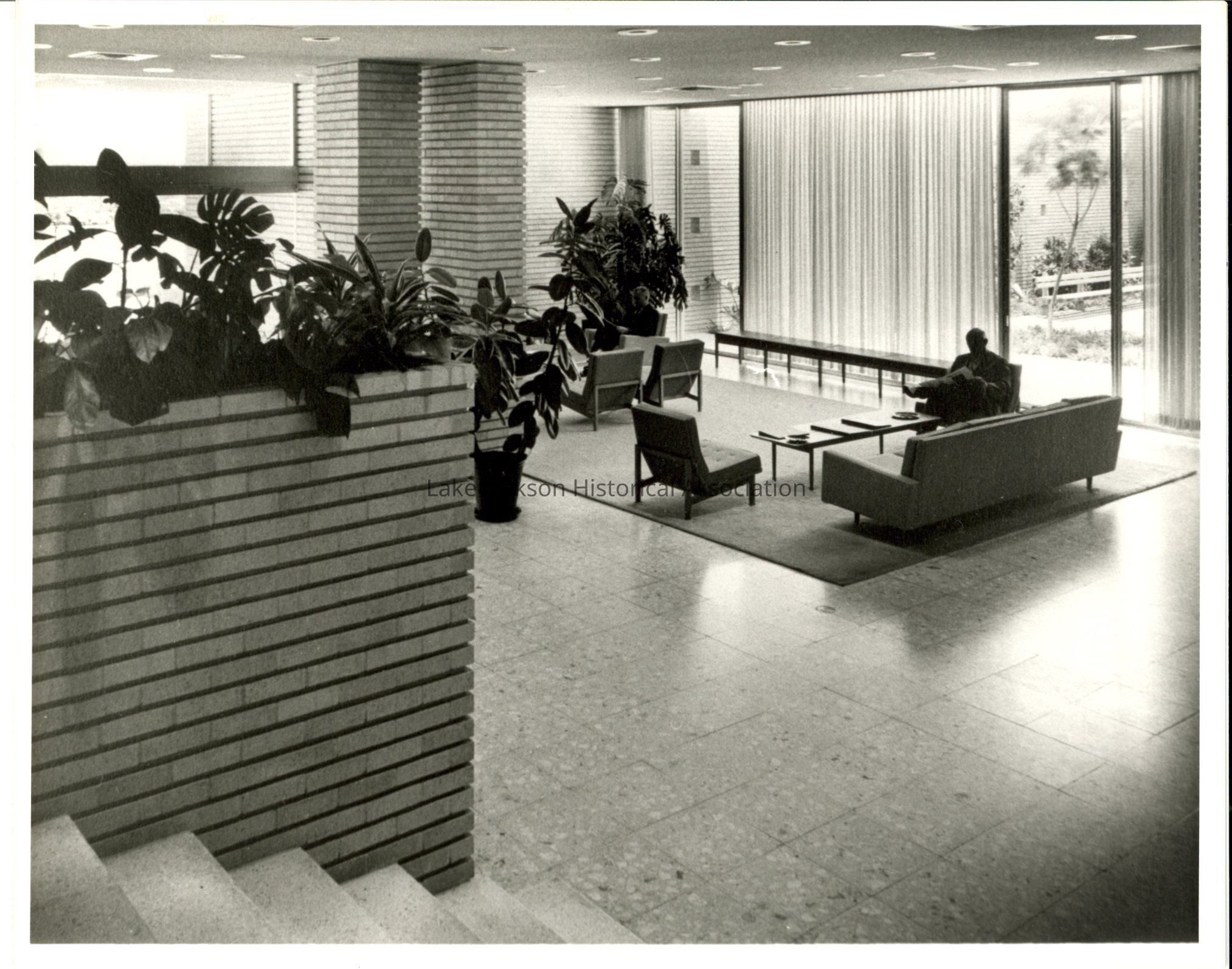 Black and white close-up photo of a lounge area in the A.P. Beutel Building at the Dow Chemical Plant, a man is seated in the loungereading a paper or magazine.Collection