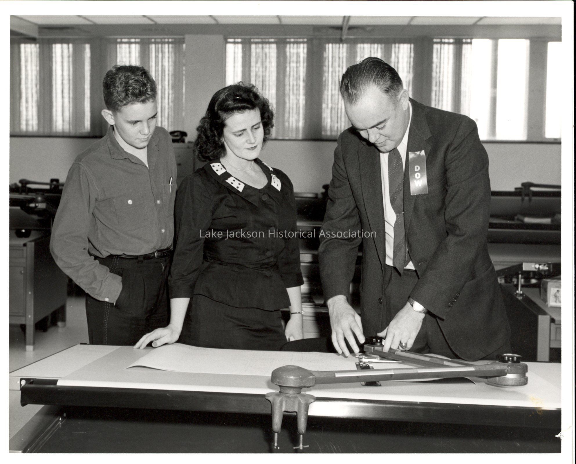 Black and white photo of a man giving a demonstrating a tool inside of the A.P. Beutel Administration building to a young couple. Taken 1957Collection