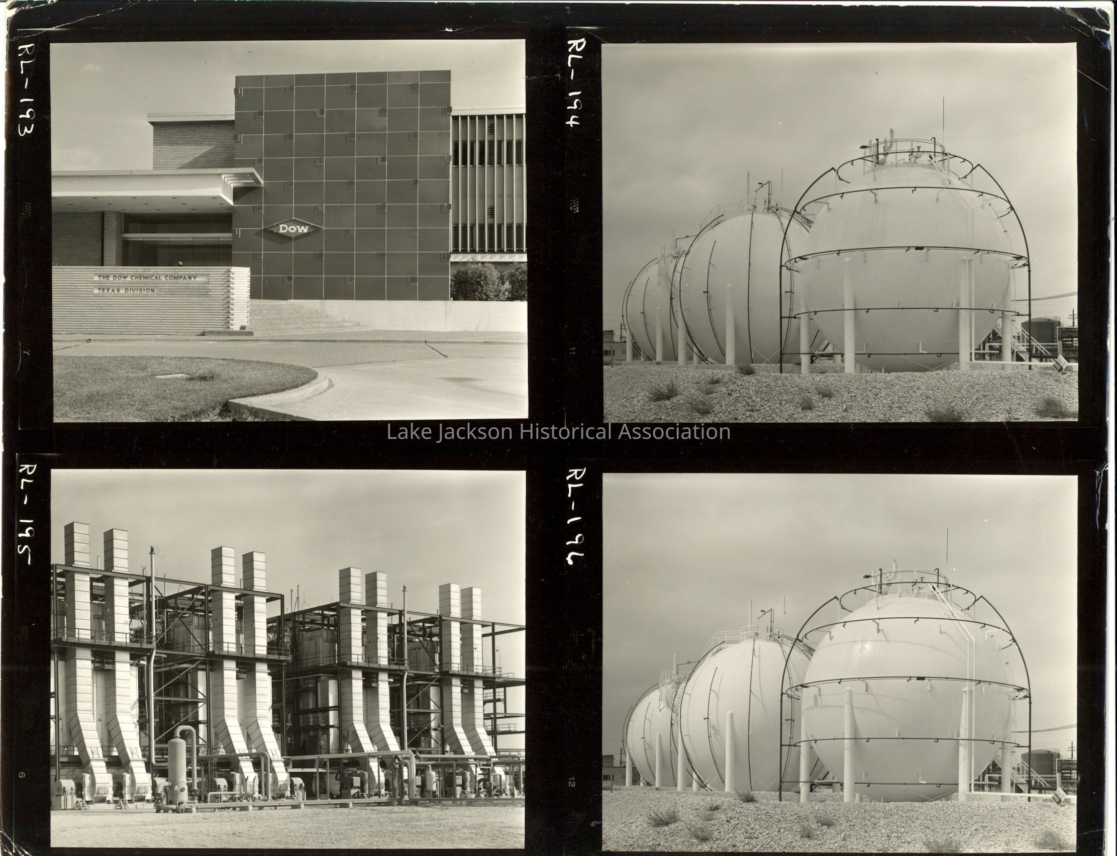 4 Black and white negative prints of the the Dow plant: 1 of the exterior of the AP Beutel Administration building, 1of the plant, and 2 of the round towers at the plant.Collection