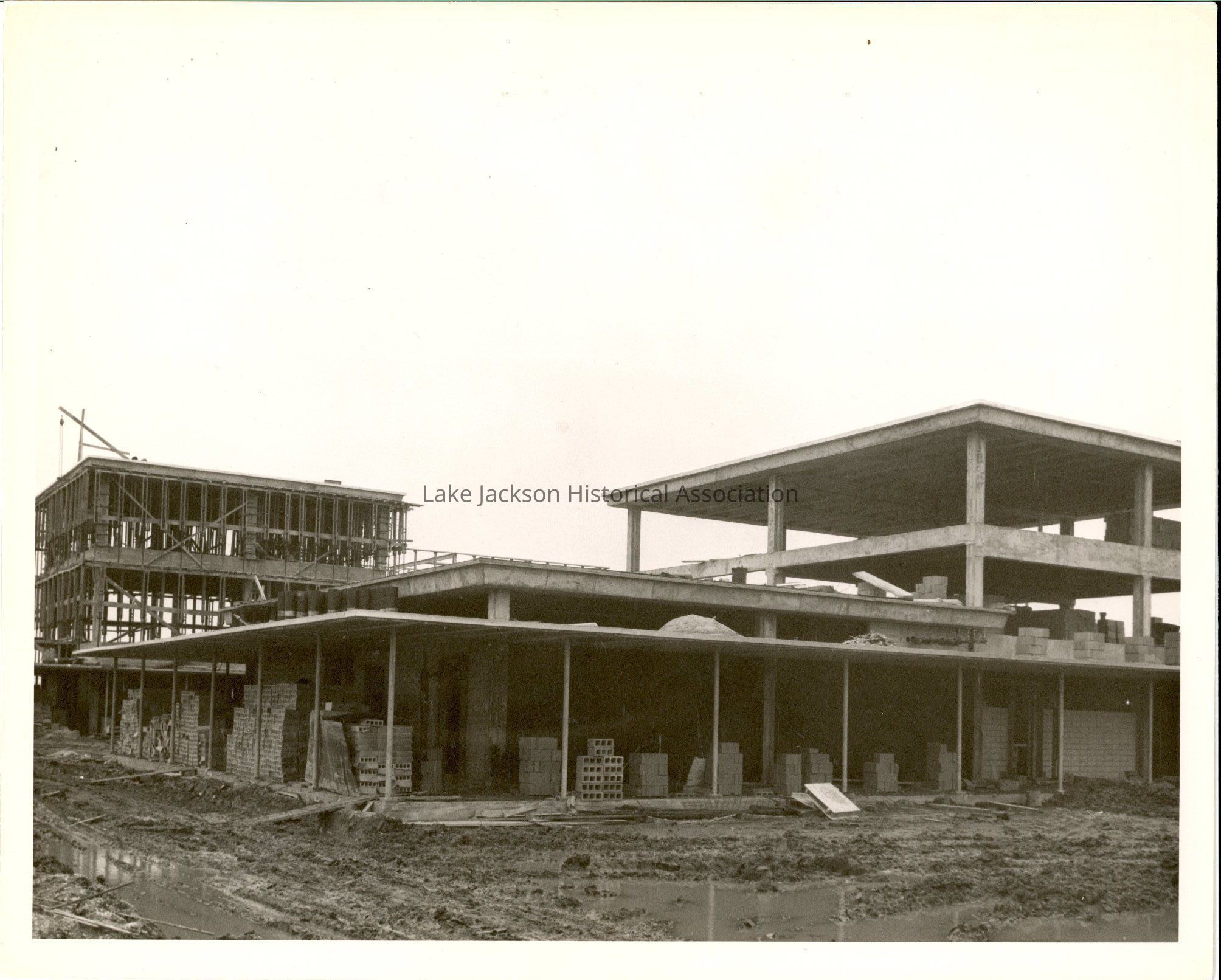 Black and white photo of the construction of the Veazey Research Center at the Dow Plant. There are no walls on the three structures that are pictured, there is only the basic skeleton of the building. Taken February 17, 1953Collection