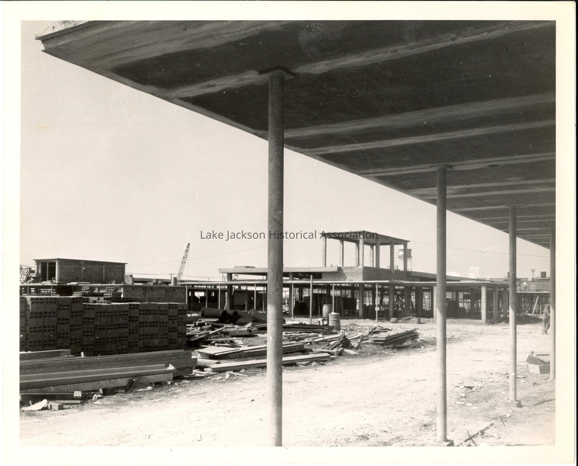 Black and white photo of the construction of the Veazey Research Center at the Dow Plant. Wood Boards and Cement Blocks can be seen throughout the photo. The photo was taken from underneath a construction buildings covered walkway. Taken October 24, 1952Collection