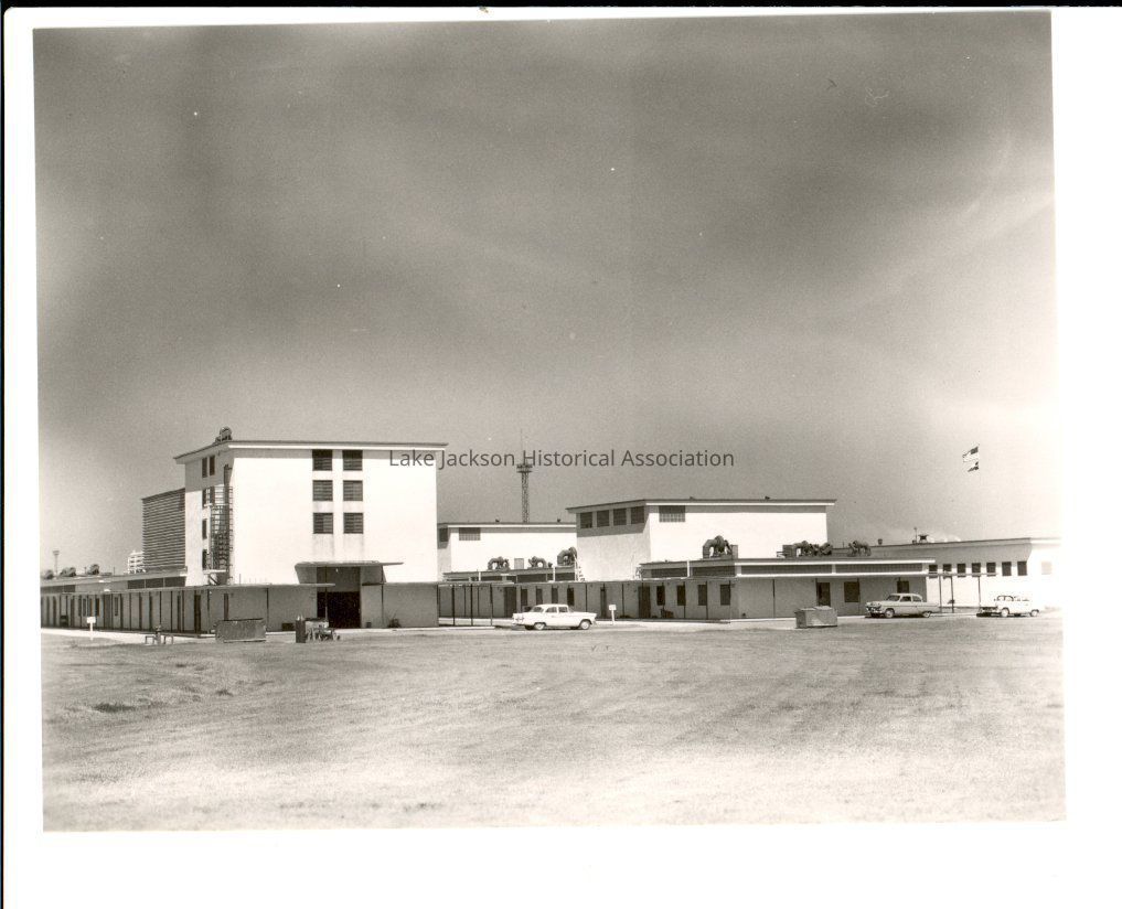 Black and white photo of the Veazey Research Center. Some cars are parked in front of the building.Collection