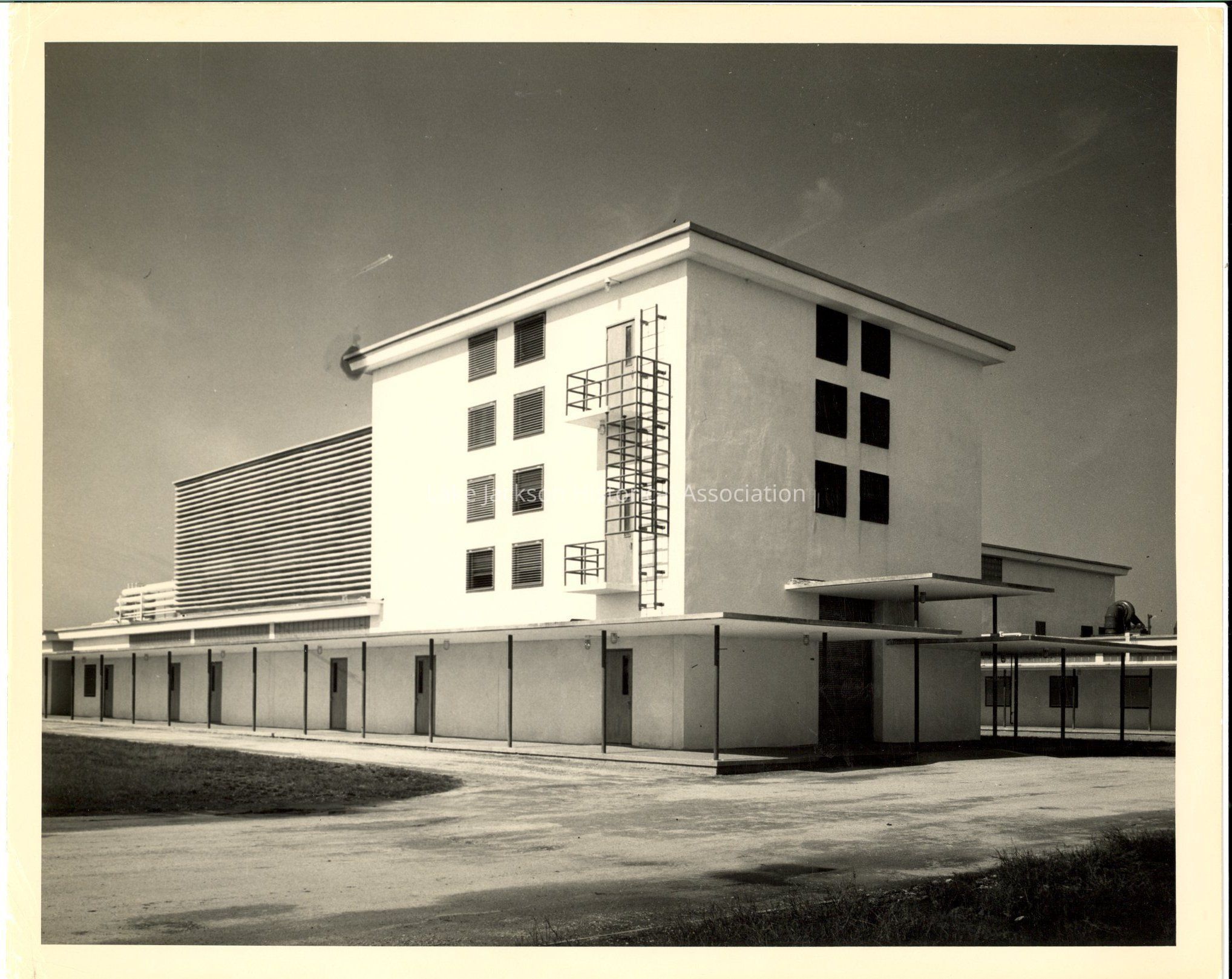 Black and white photo of a close-up view of one of the buildings at the Veazey Research Center . Taken November 5, 1953Collection