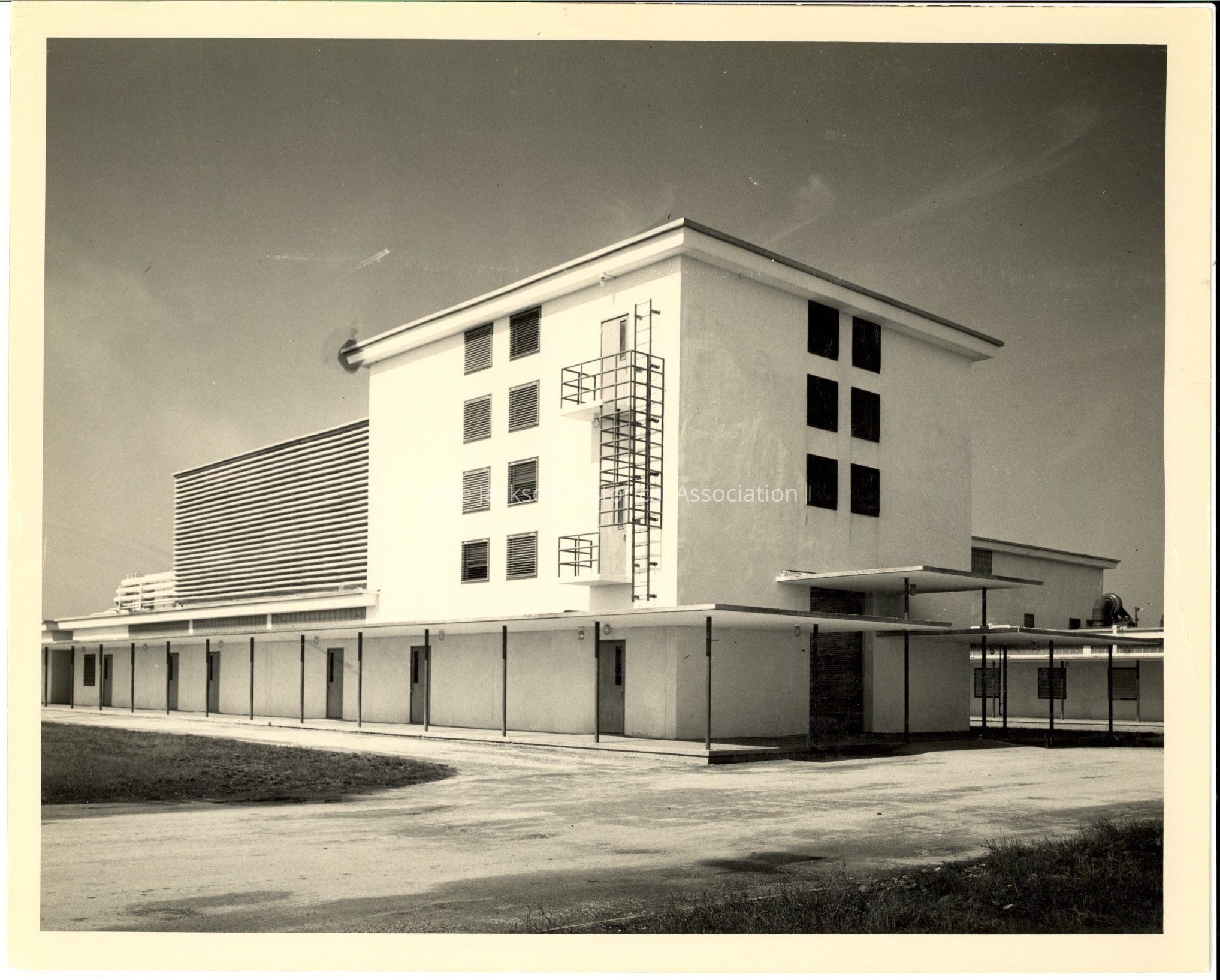 Black and white photo of a close-up view of one of the buildings at the Veazey Research Center . Taken November 5, 1953Collection
