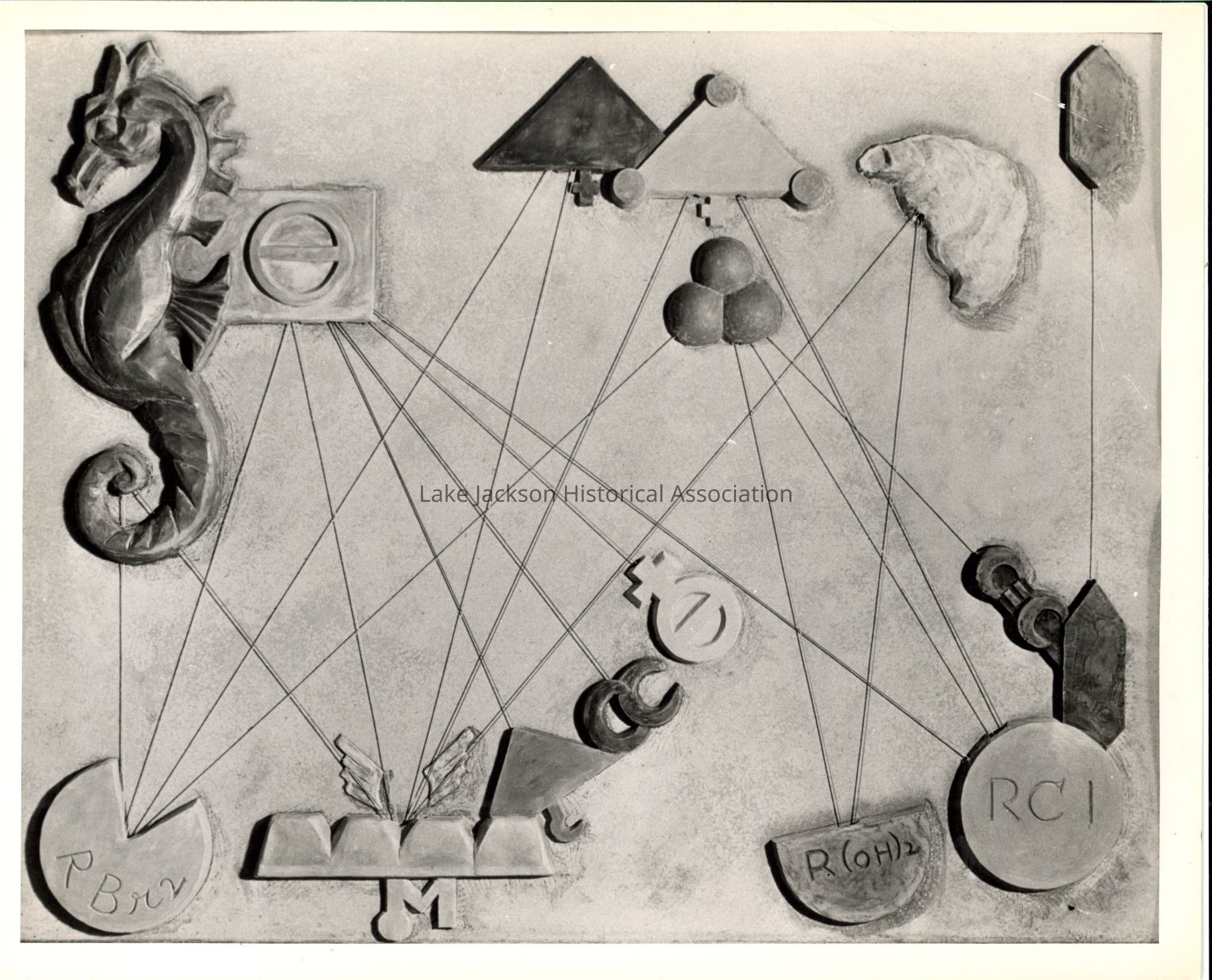 Black and white photo of the Veazey Research Center entrance way, showing a close up of one of the scultped images on its walls. Taken July 20, 1953Collection