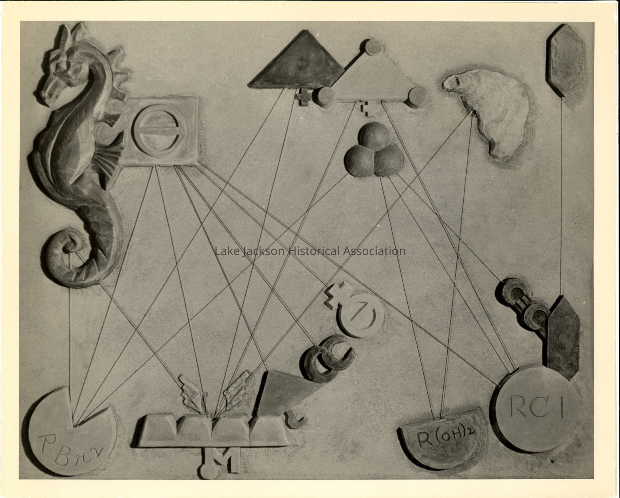 Black and white photo of the Veazey Research Center entrance way, showing a close up of one of the scultped images on its walls. Taken July 20, 1953Collection