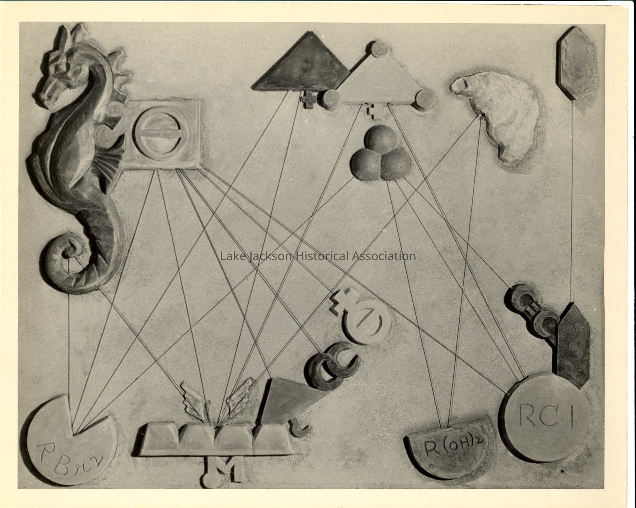 Black and white photo of the Veazey Research Center entrance way, showing a close up of one of the scultped images on its walls. Taken July 20, 1953Collection