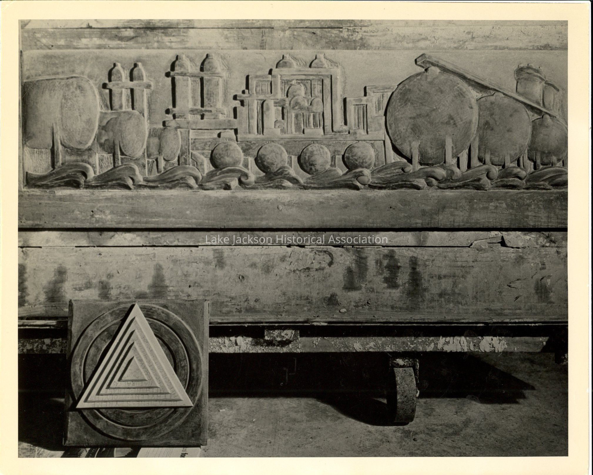 Black and white photo of the Veazey Research Center entrance way, showing a close up of one of the scultped images of a chemical plant on its walls. Taken July 20, 1953Collection