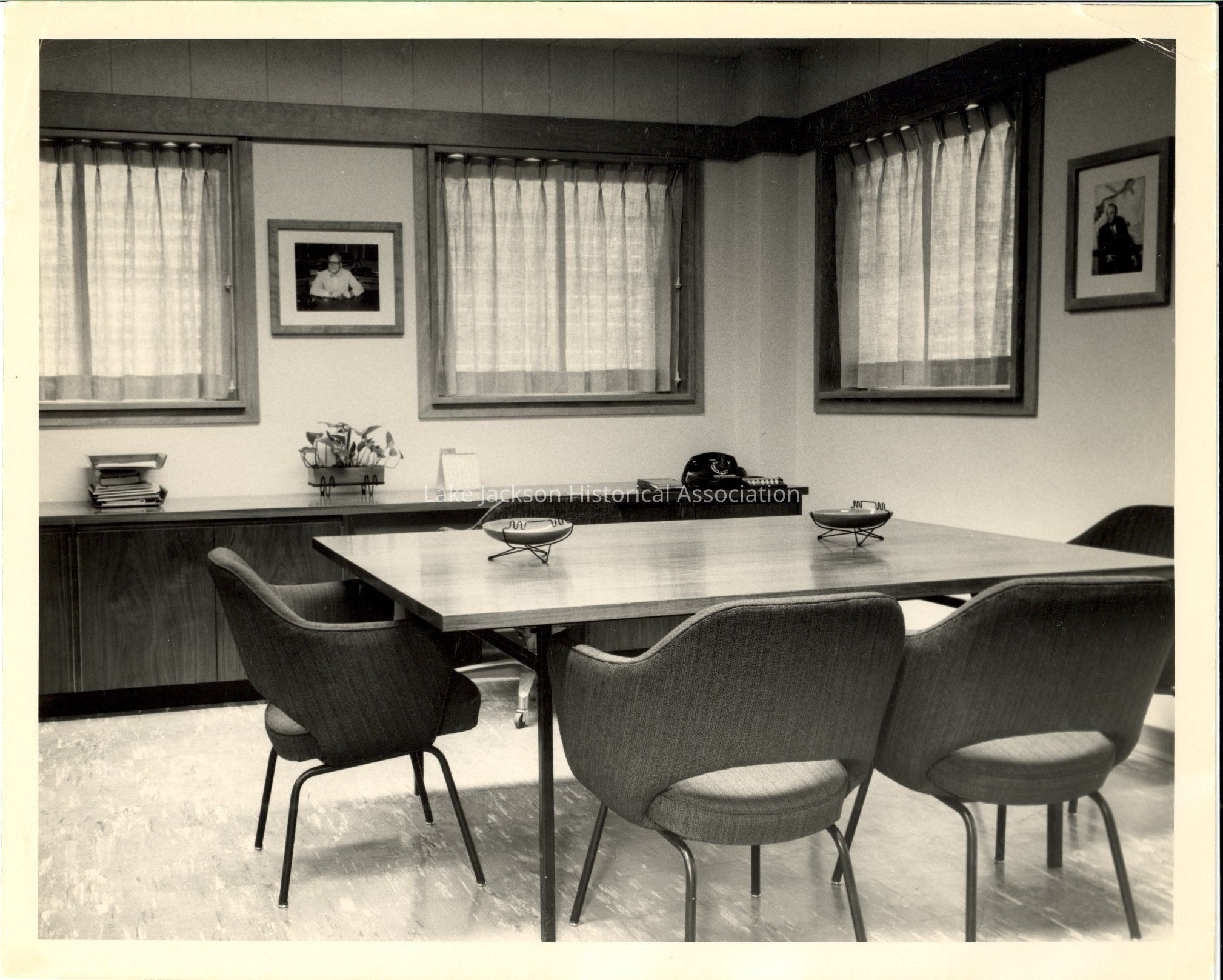 Black and white photo of the Veazey Research Center employee lounge, showing a table with ash trays, a phone on the counter behind it and a photo of A.P Beutel on the wall and a photo of another gentleman on the side wall. Taken Novemeber 2, 1953Collection