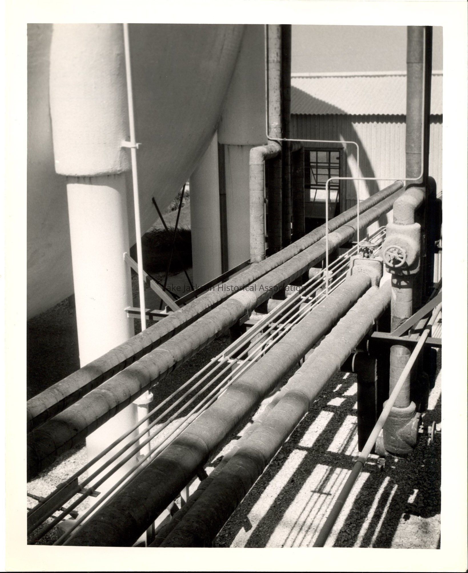 Black and white photo of the Veazey Research Center, showing a close up of pipes outside of the buildings. Taken September 9, 1953Collection