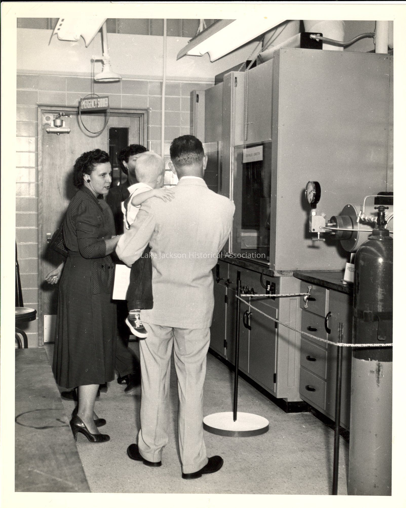 Black and white photo of of a family touring the Veazey Research Center. Above the door behind them note overhead a sign reading "Emergency Shower" and a shower head is above.Collection