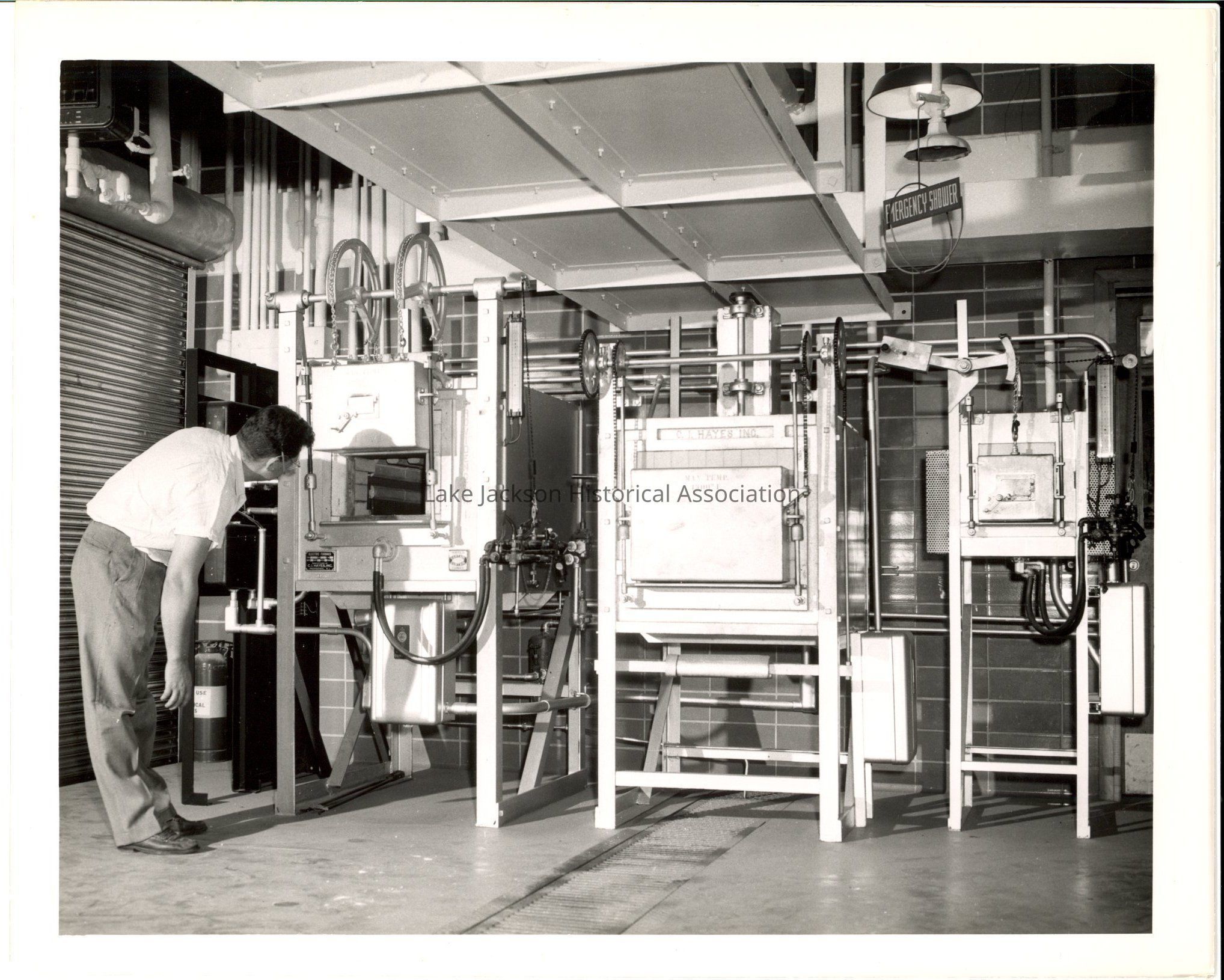 Black and white photo of a man looking at one of three furances durning the dedication of the Veazey Research Center. On one of the furnaces you can read : Max Temp 1300F and there is also an emergency shower located overhead.Collection