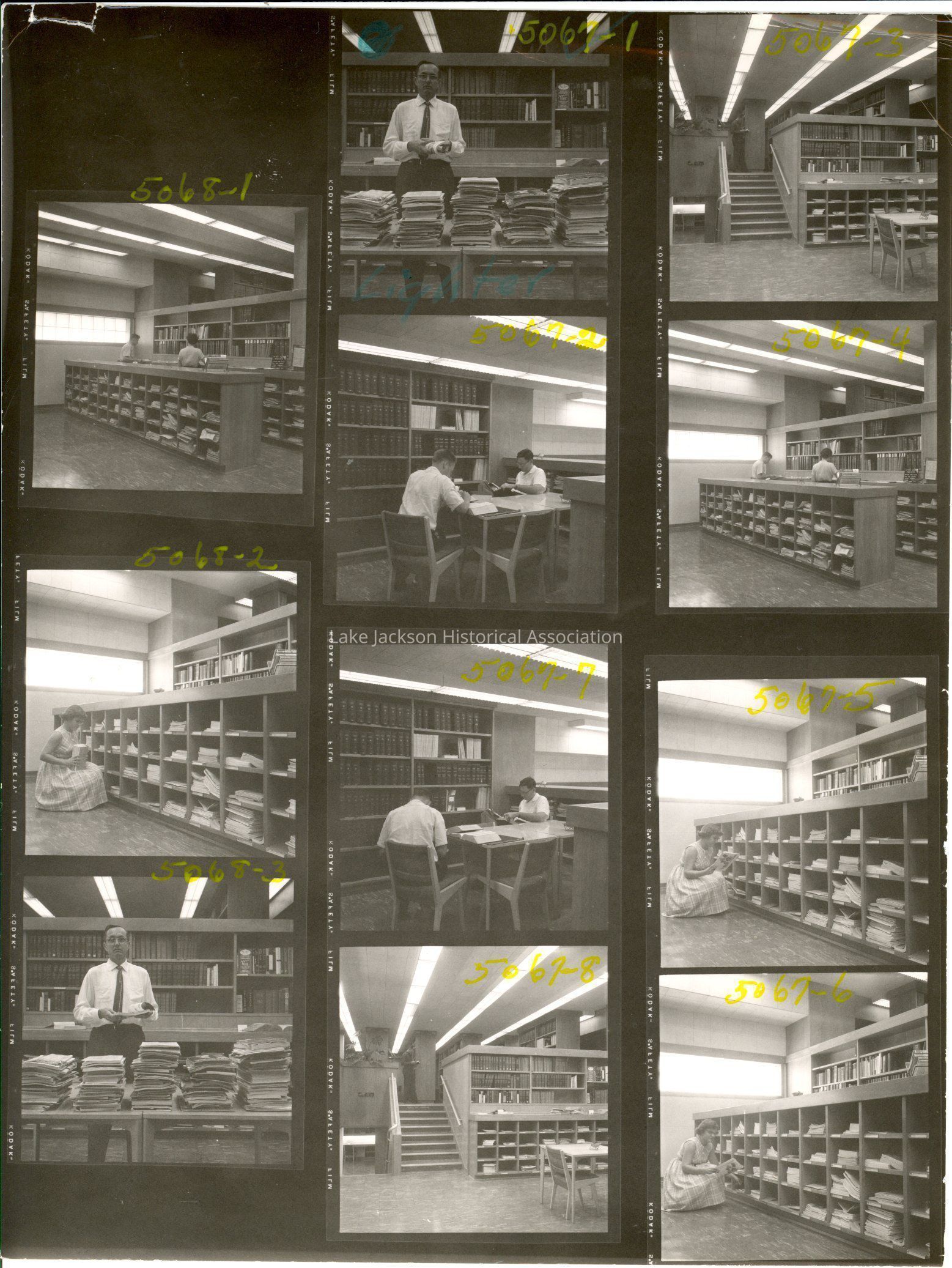 Black and white proof photos of people in the Dow Texas Division Library at the Veazey Research Center. John Eben with stacks of periodicals.Collection