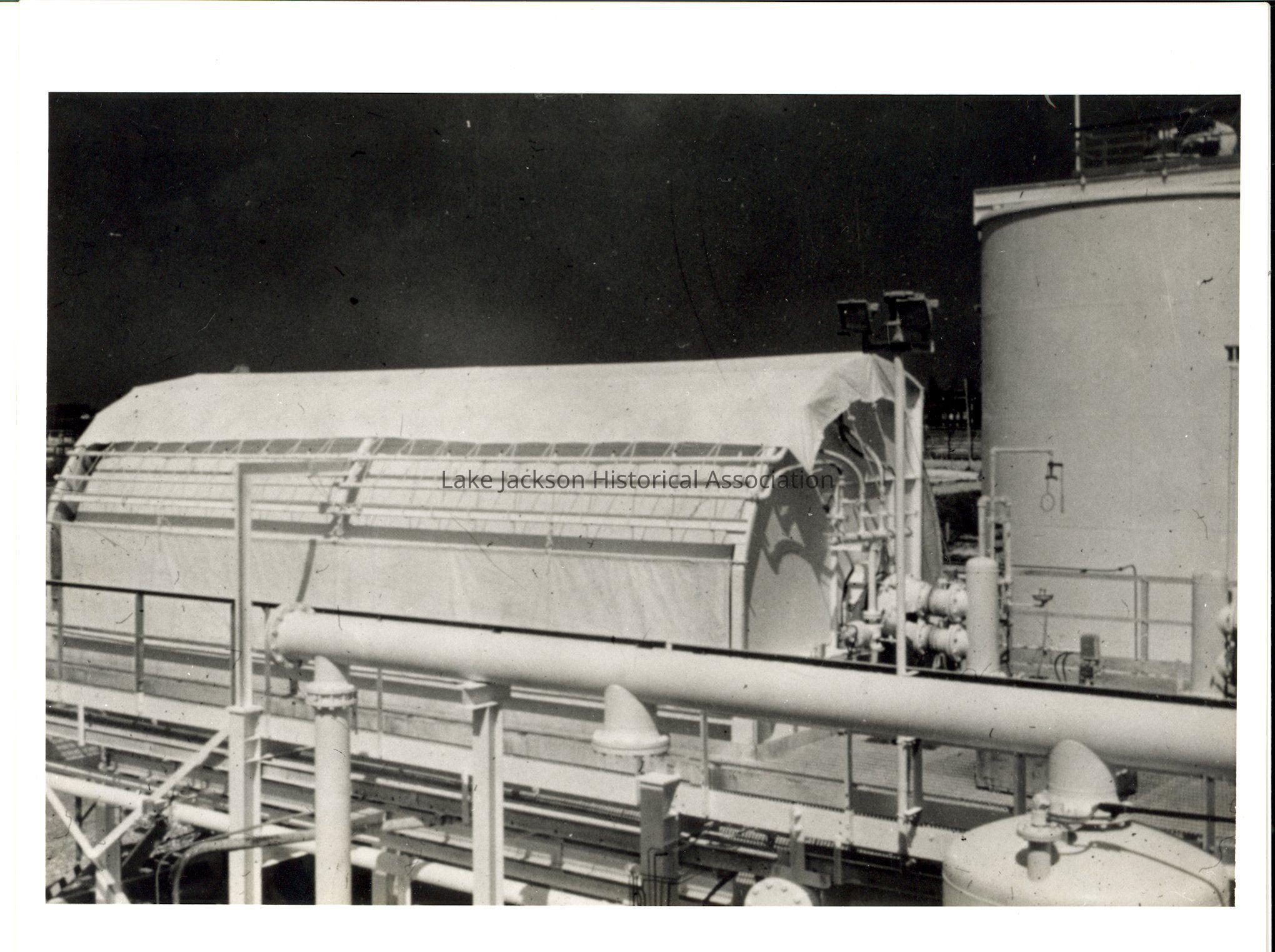 Black and white close-up photo of a section of the rotary filter process of Dow, at the stage pictured, the magnesium hydroxide is saturated with seawater, and as much of this as is possible must be removed in a filtering operation. The filters used are simply rotary driven which permit internal suction to be applied until a cake of magnesiom hydroxide about 1 1/2 inches is built up.Collection