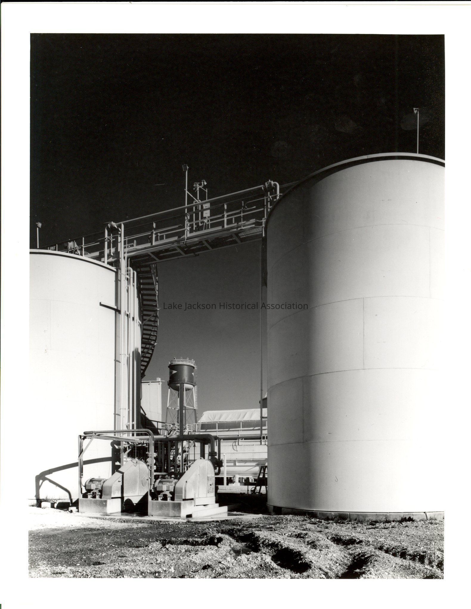 Black and white close-up photo of the storage tank section of the rotary filter process at Dow , at the stage pictured, the magnesium hydroxide is saturated with seawater, and as much of this as is possible must be removed in a filtering operation. The filters used are simply rotary driven which permit internal suction to be applied until a cake of magnesiom hydroxide about 1 1/2 inches is built up.Collection