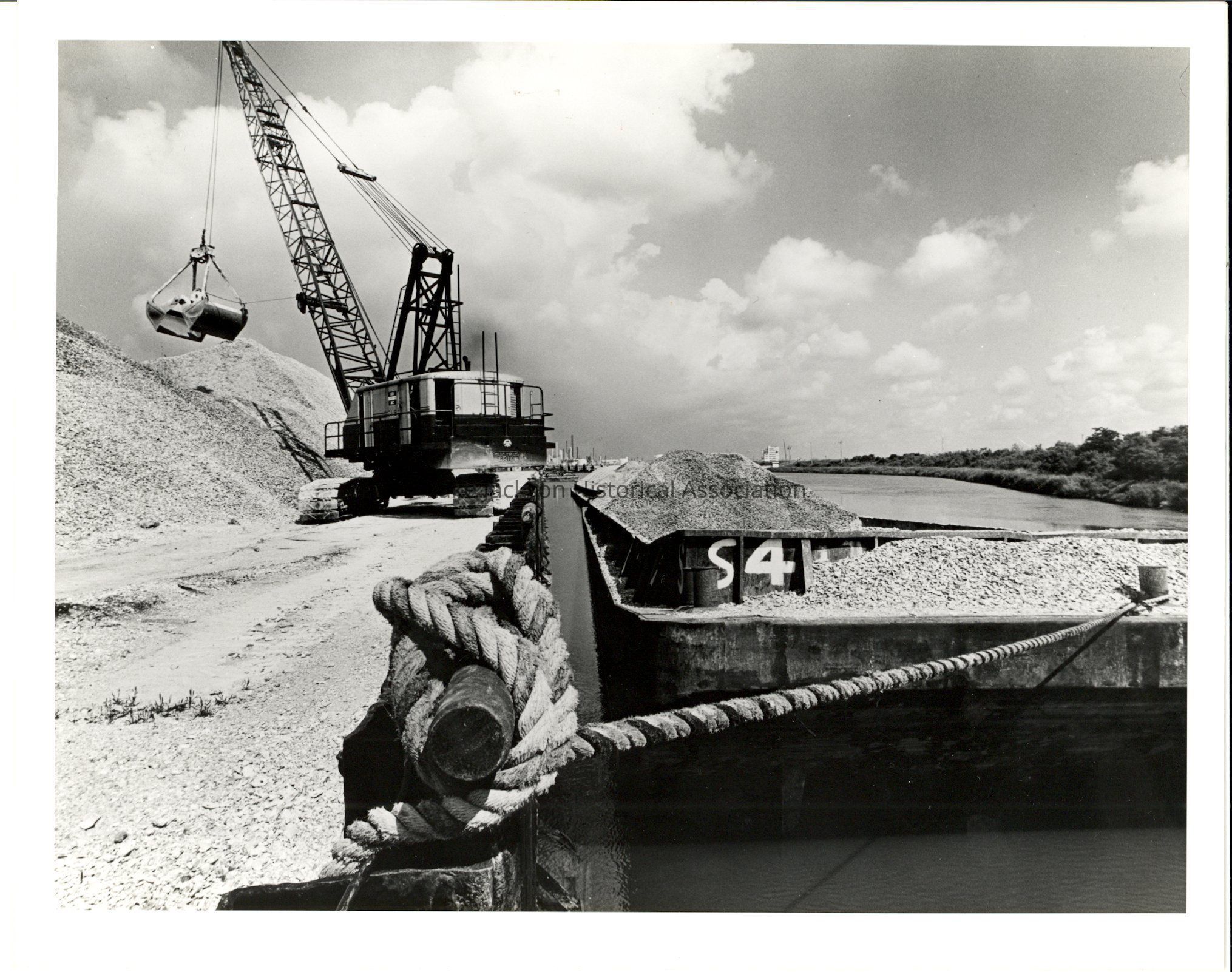 Black and white photo of a crane unloading shell from a barge. Shell is unloaded from the barges by cranes with clam-shell buckets and moved by conveyors to a rotary shell washer where mud, sand, and tiny marine life must be washed from the shell to prevent the formation of mud rings in the lime kilns. After the shell has been washed, it is them moved to storage, or to the lime kilns, by conveyors.Collection