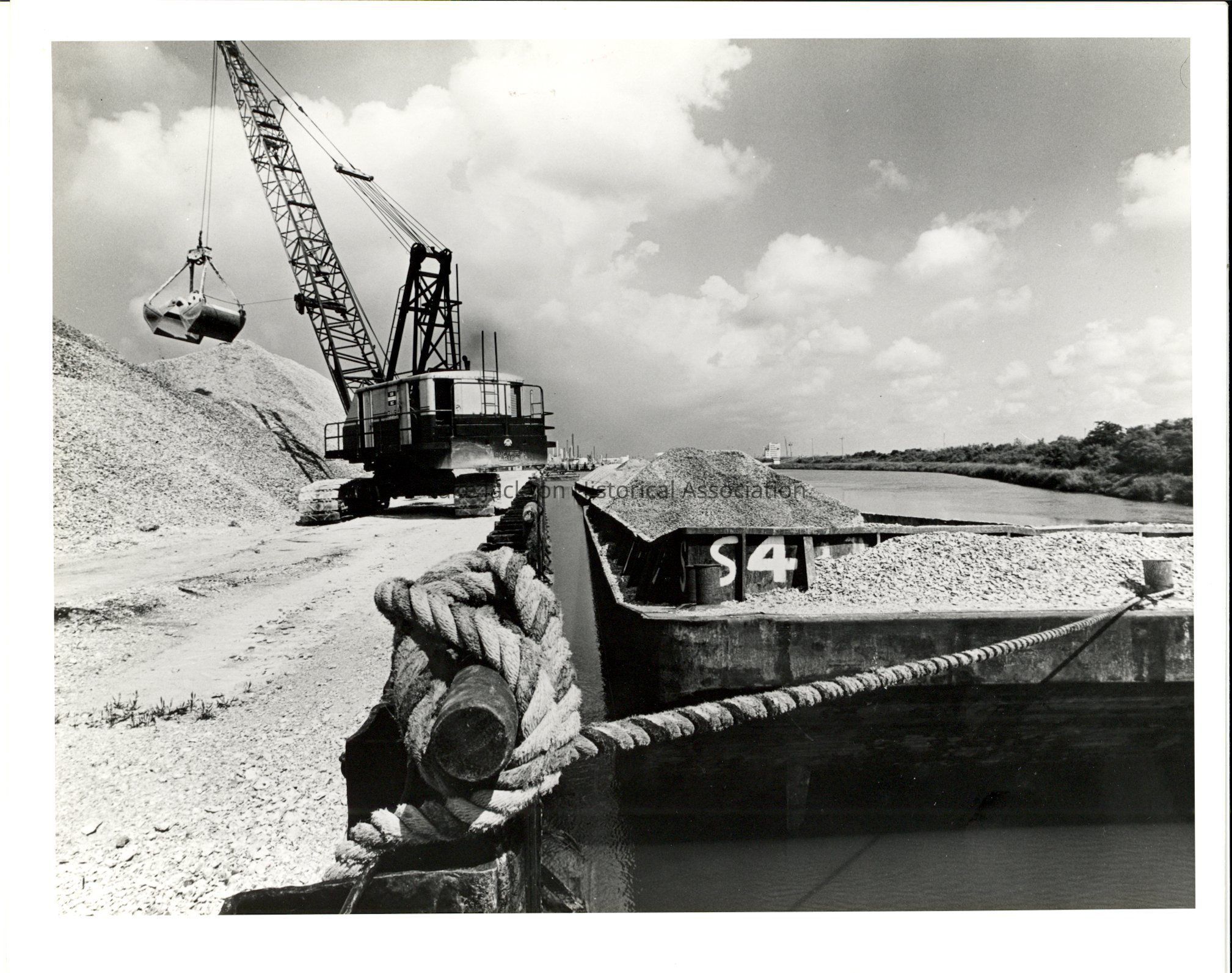 Black and white photo of a crane unloading shell from a barge. Shell is unloaded from the barges by cranes with clam-shell buckets and moved by conveyors to a rotary shell washer where mud, sand, and tiny marine life must be washed from the shell to prevent the formation of mud rings in the lime kilns. After the shell has been washed, it is them moved to storage, or to the lime kilns, by conveyors.Collection