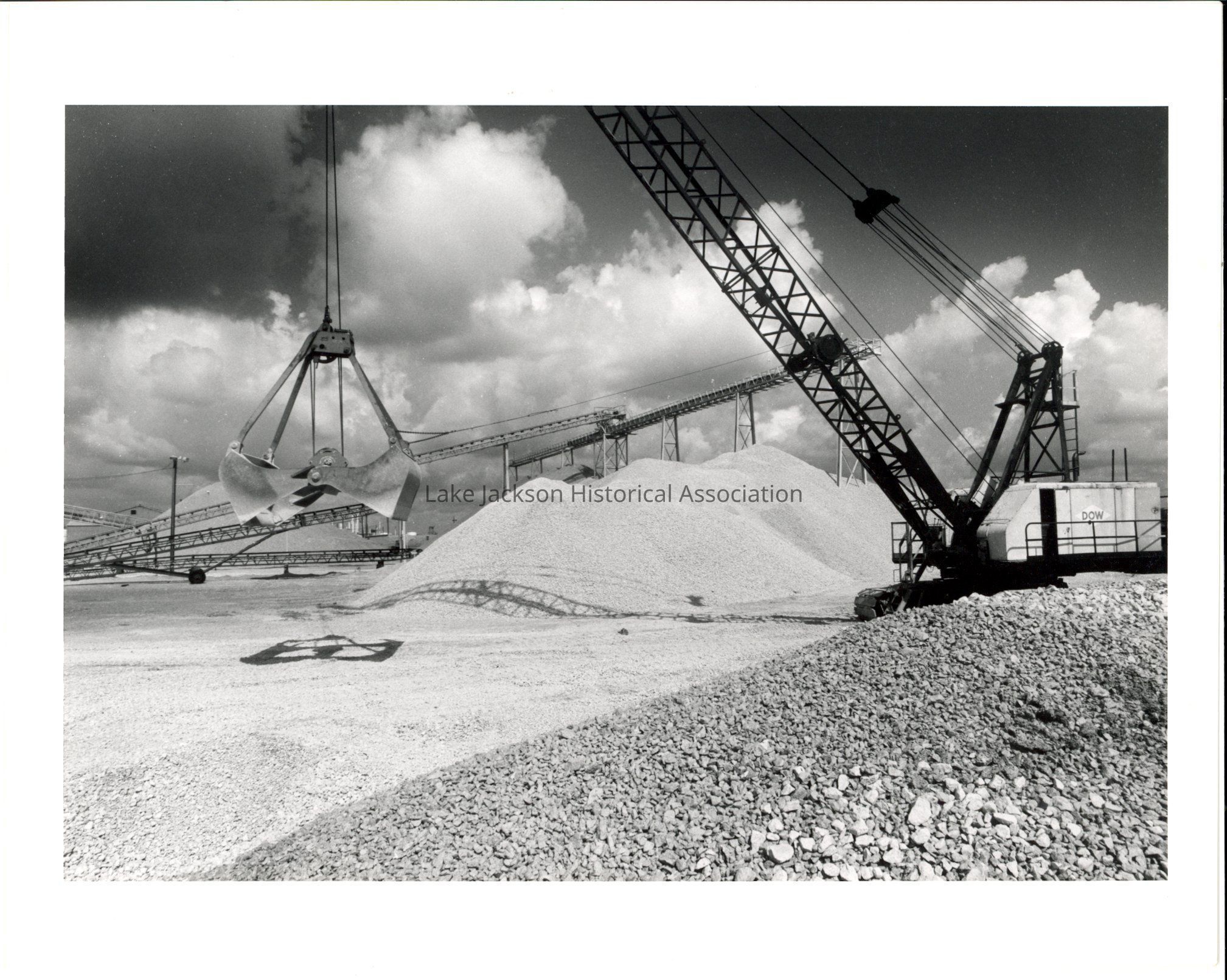 Black and white photo of a crane as unloads the shell it just lifted from a barge, conveyors can be seen in the background. Shell is unloaded from the barges by cranes with clam-shell buckets and moved by conveyors to a rotary shell washer where mud, sand, and tiny marine life must be washed from the shell to prevent the formation of mud rings in the lime kilns. After the shell has been washed, it is them moved to storage, or to the lime kilns, by conveyors.Collection