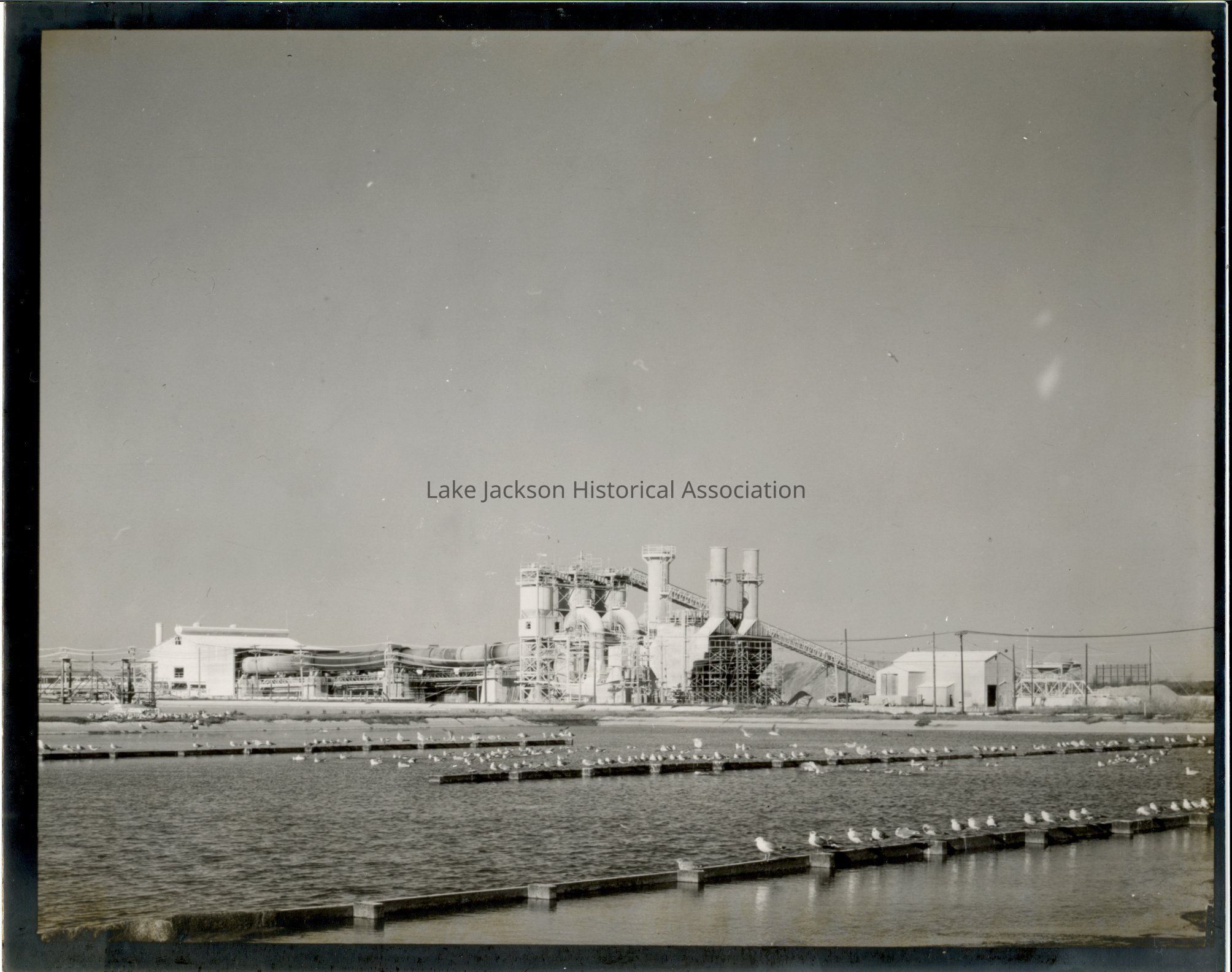 Black and white distant right-angle photo of the lime kiln section at Dow. Lime kilns are about 250 Feet long with an ID of 7 feet and are lined with refractory brick. The dolomite is heated to 1300 C to decompose and drive off carbon dioxide, leaving calcium oxide and magnesium oxide, or dolime. Taken November 1975.Collection