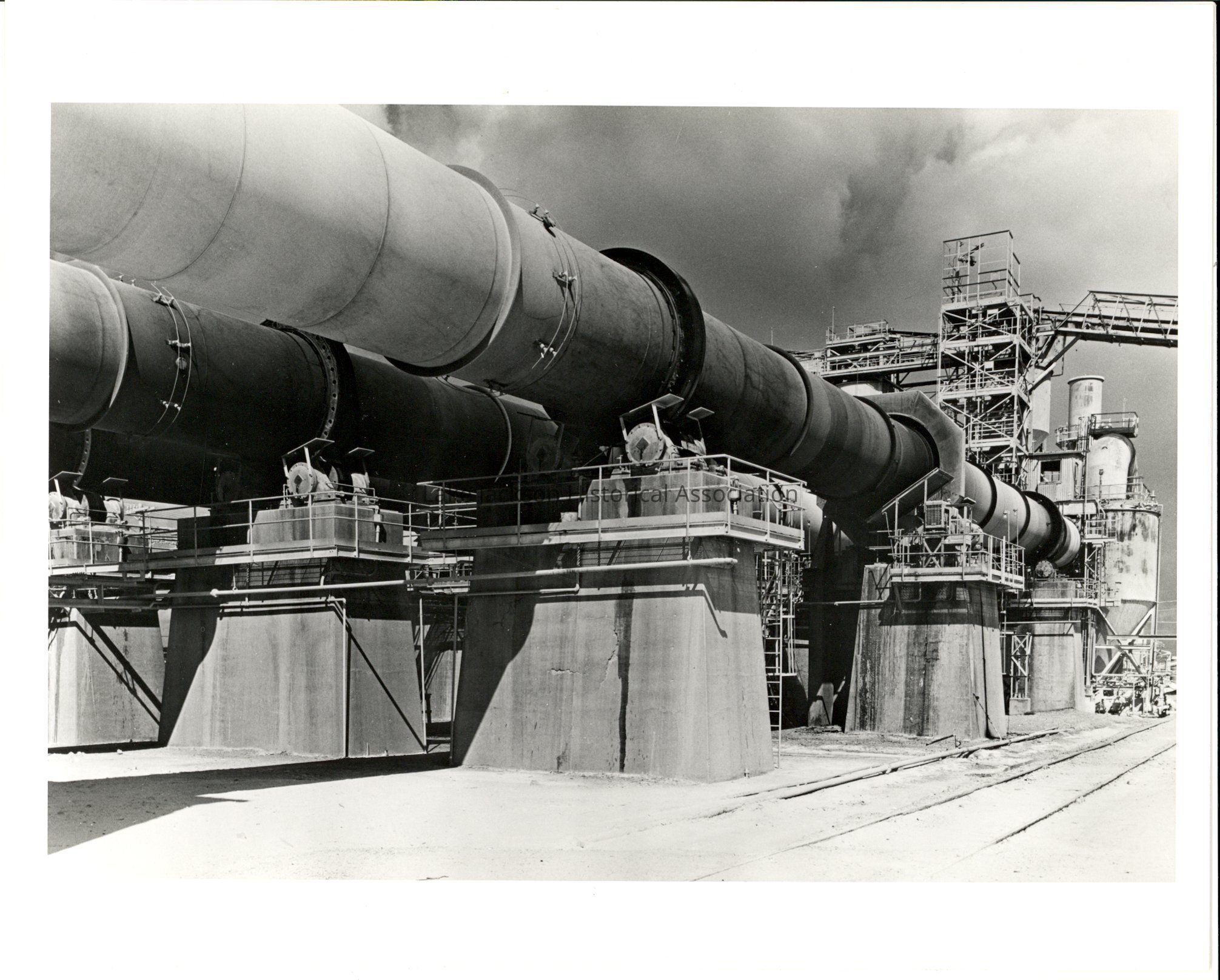 Black and white photo of the large pipping of the lime kiln section at Dow. Lime kilns are about 250 Feet long with an ID of 7 feet and are lined with refractory brick. The dolomite is heated to 1300 C to decompose and drive off carbon dioxide, leaving calcium oxide and magnesium oxide, or dolime. Taken November 1975.Collection