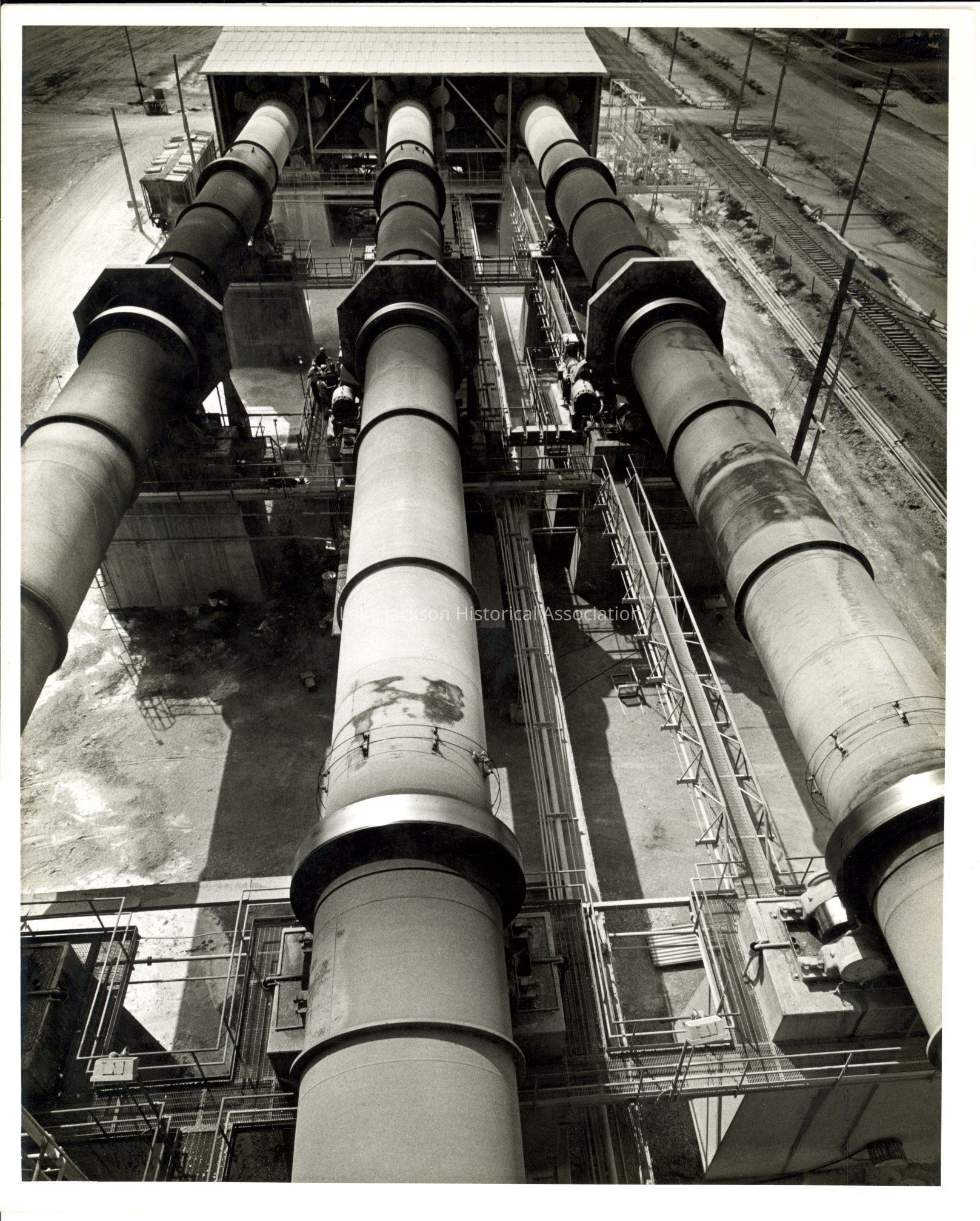 Black and white top-view photo of three large pipes of the lime kiln section at Dow. Lime kilns are about 250 Feet long with an ID of 7 feet and are lined with refractory brick. The dolomite is heated to 1300 C to decompose and drive off carbon dioxide, leaving calcium oxide and magnesium oxide, or dolime. Taken November 1975.Collection