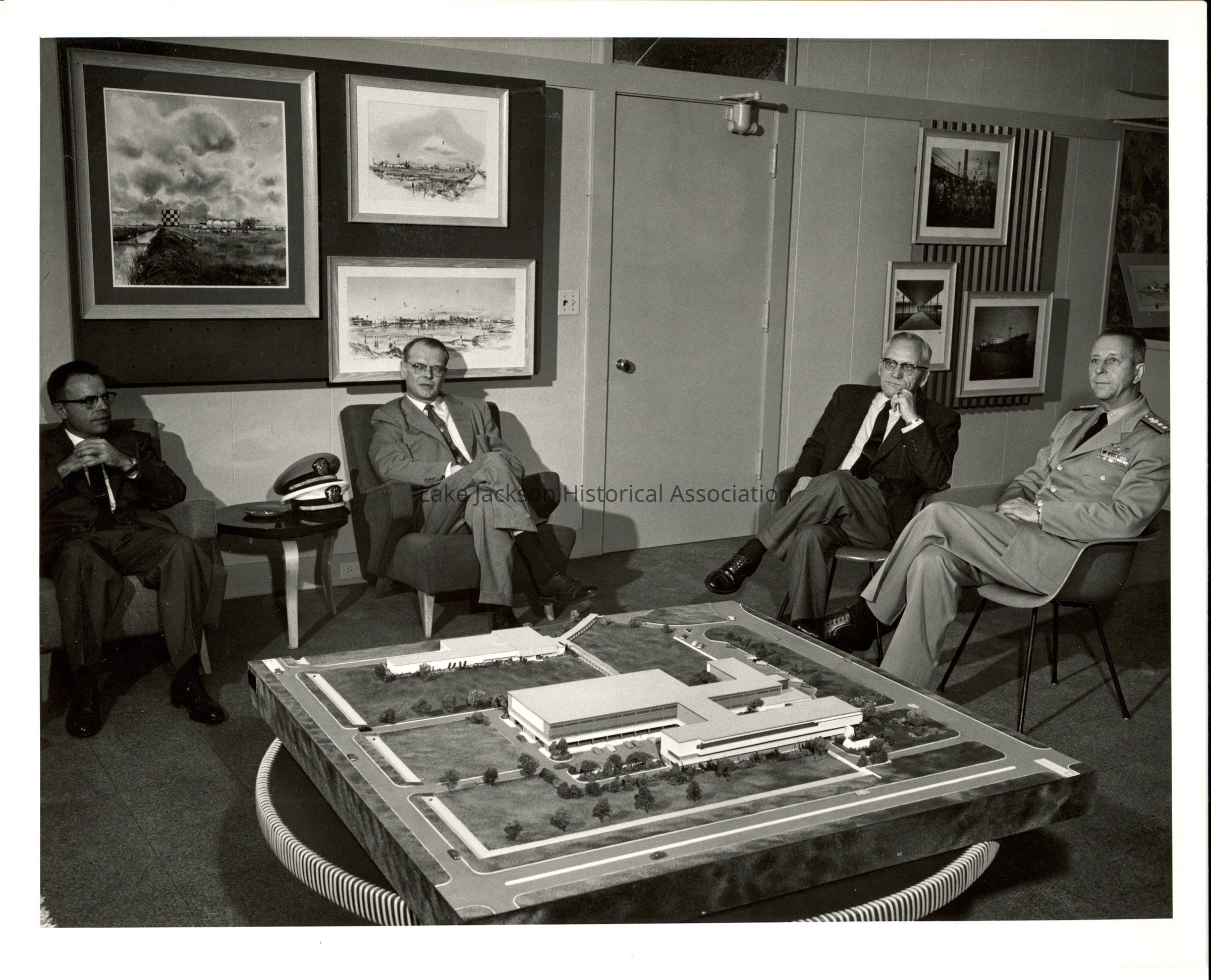 1- Black and white photo of Dr. Beutel with a group of men in his office reviewing a diorama of plans for the Administration Center. One of the men is in military attire.Collection