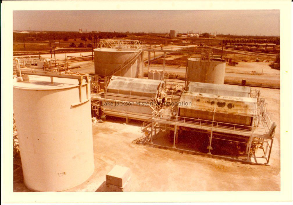 Color photo of the water tanks and the kiln buildings at the Dow plant in the lime kiln section.Collection
