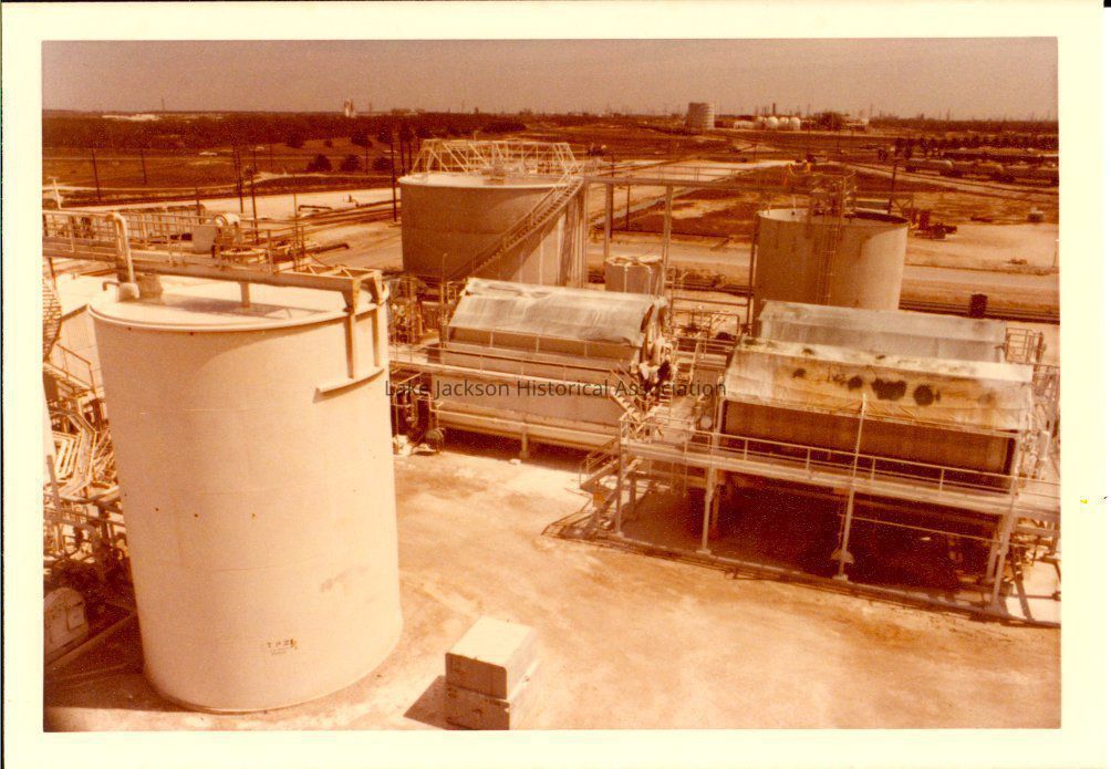 Color photo of the water tanks and the kiln buildings at the Dow plant in the lime kiln section.Collection