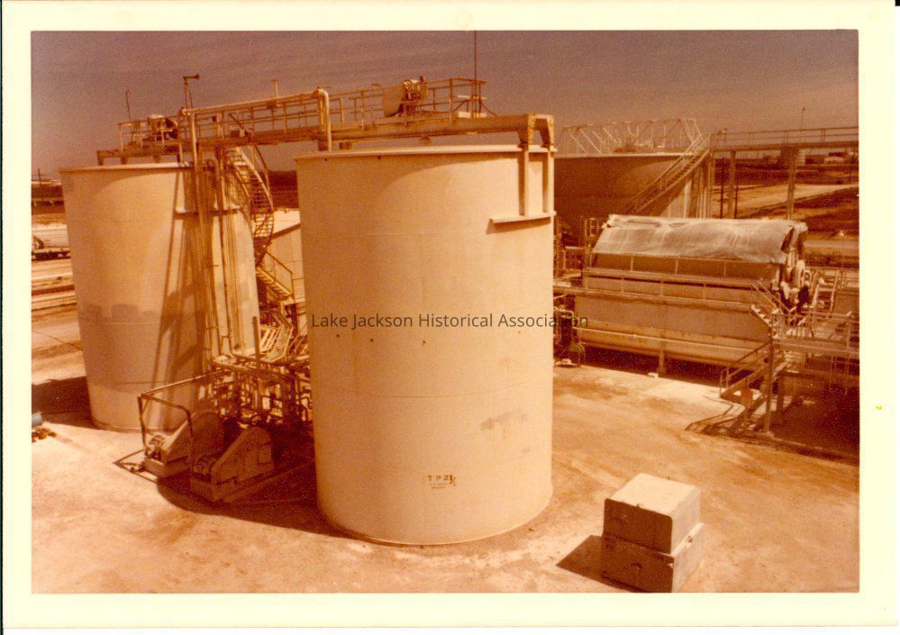 Color photo of the water tanks and the kiln buildings at the Dow plant in the lime kiln section. Close up on the water tanks.Collection