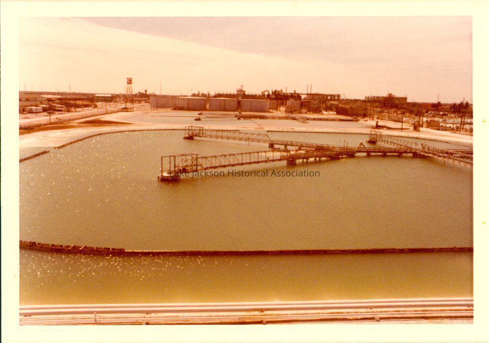 Black and white photo of dorr pond and lime kiln plant building in the background.Collection