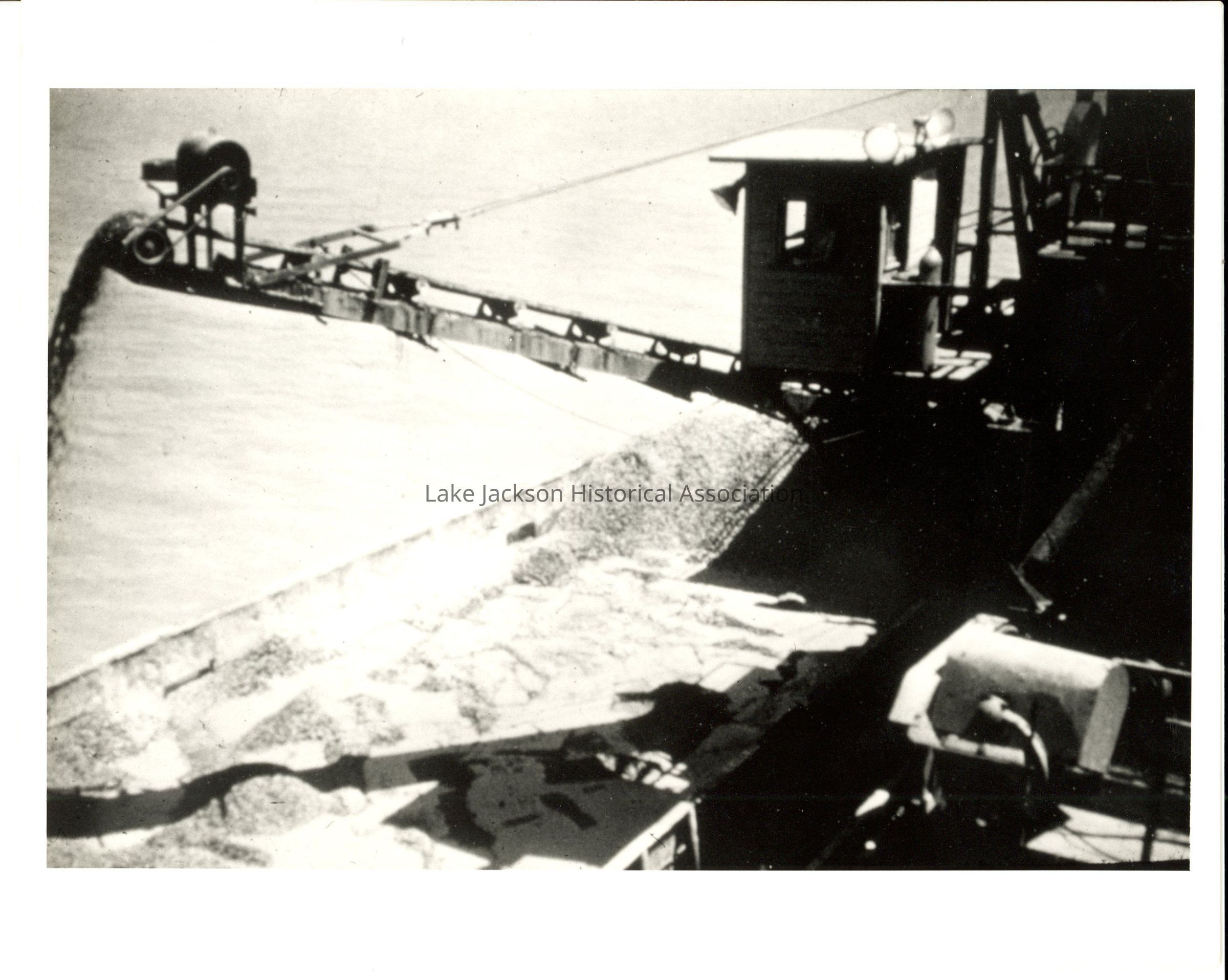 Black and white photo of machinery dredging oyster shell for magnesium. Magnesium is precipitated from seawaer by treating it with lime made from oyster shells which are removed from coastal bays by dredges. The oyster shell is washed and screened before loading into a barge for movement to the Dow Plants.Collection
