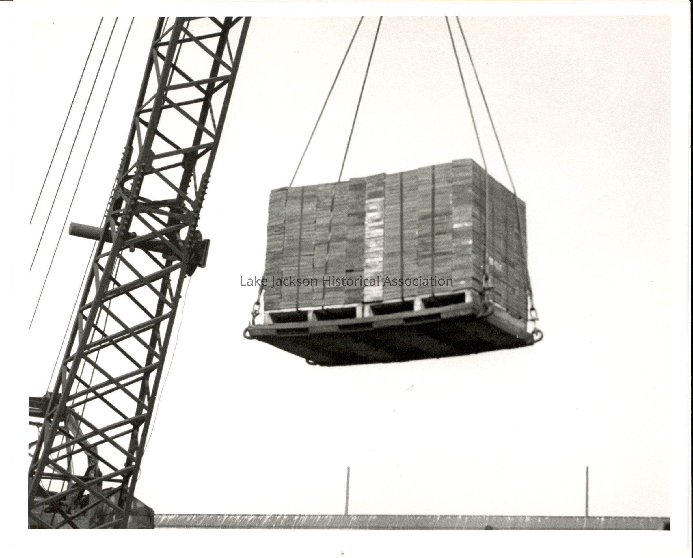 Black and white photo of a crane lifting a stack of silver bars of magnesium at Dow's Texas Division in Freeport.Collection