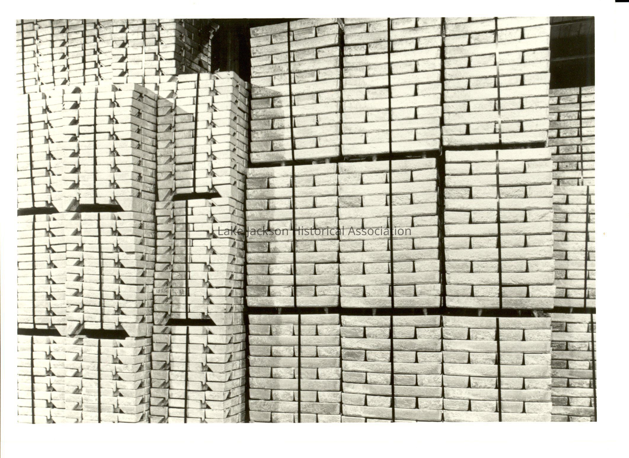 Black and white photo of stacks of silver bars of magnesion at Dow's Texas Division in Freeport await shipment to customers.Collection