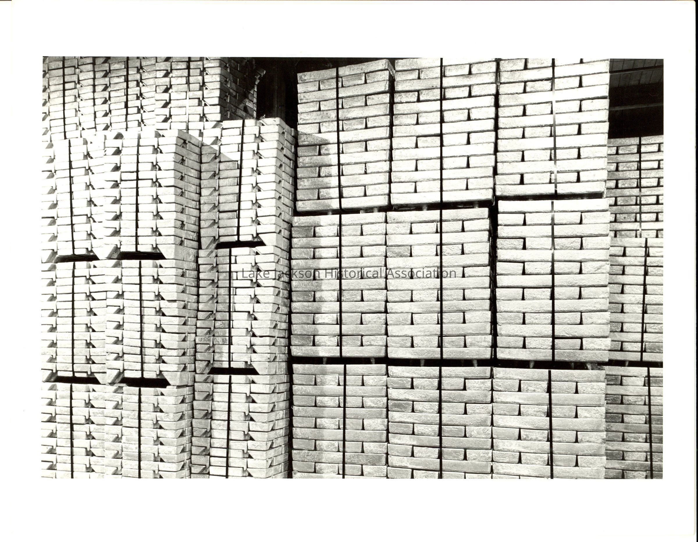 Black and white photo of stacks of silver bars (ignots) of magnesion at Dow's Texas Division in Freeport await shipment to customers.Collection