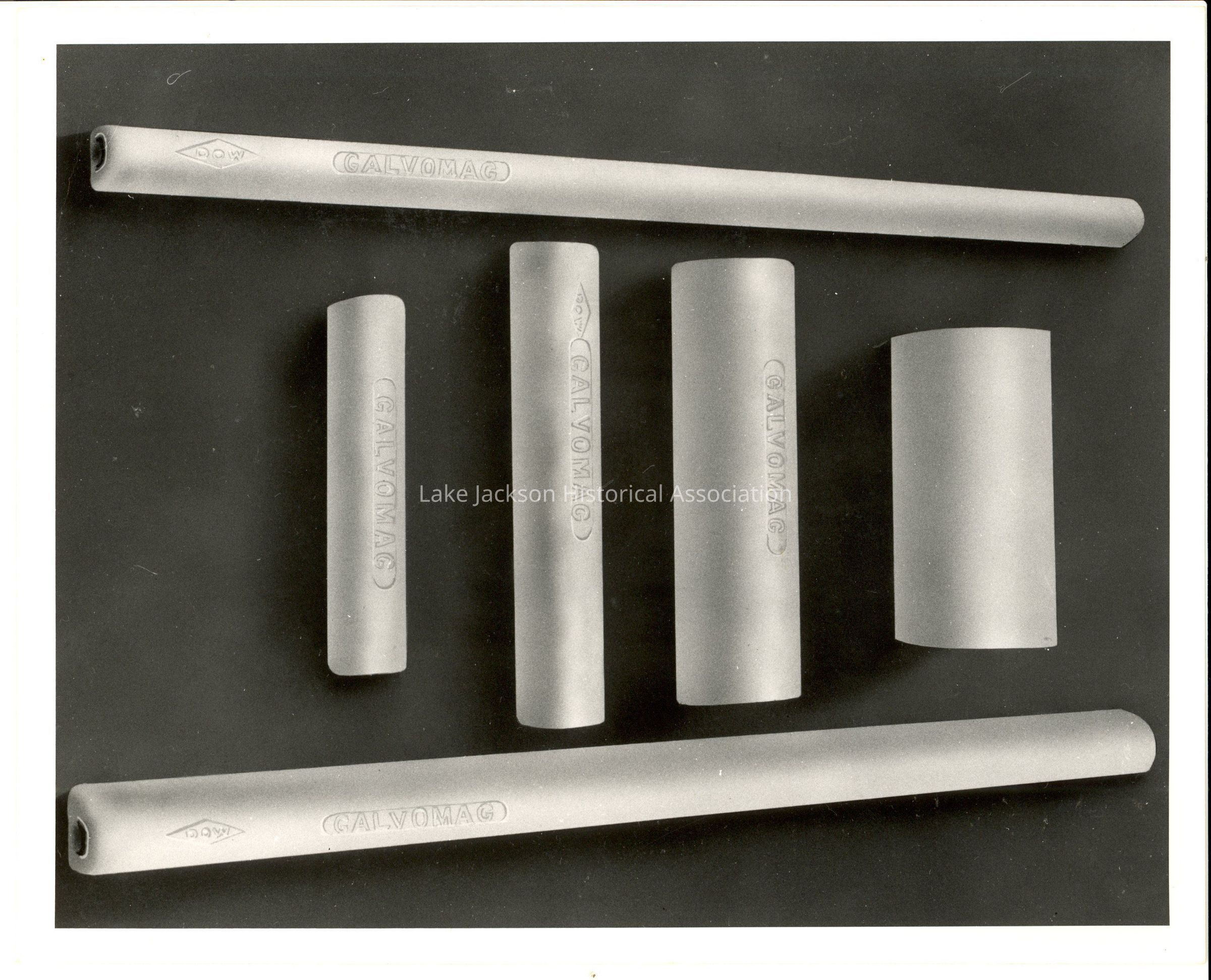 Black and white photo of six bars of "Galvomag" with this and "Dow" written many of them. Believe this is galvonized magnesium.Collection