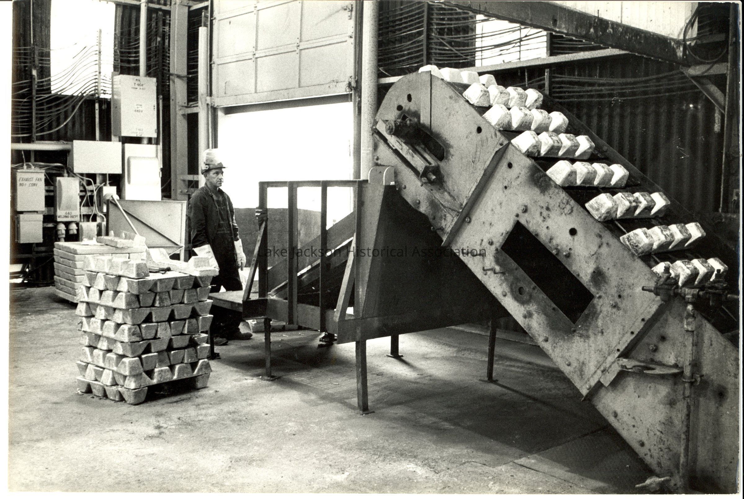 Black and white photo of a man stacking magnesium ignots in the magnesium casting area of Dow.Collection