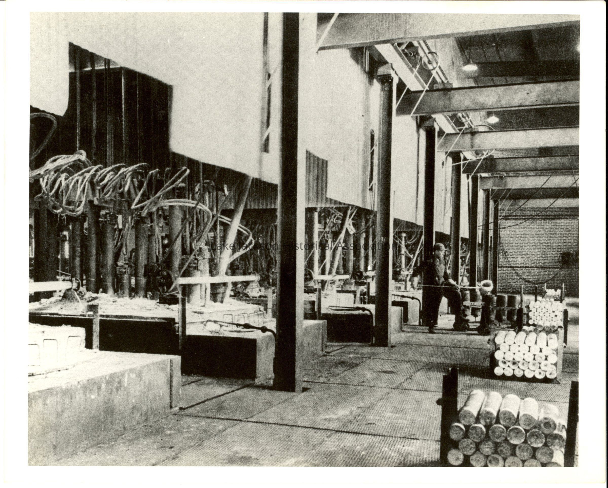Black and white photo of a man at work in the mag cell section of the Dow plant. He seems to pouring metal into a cast.Collection