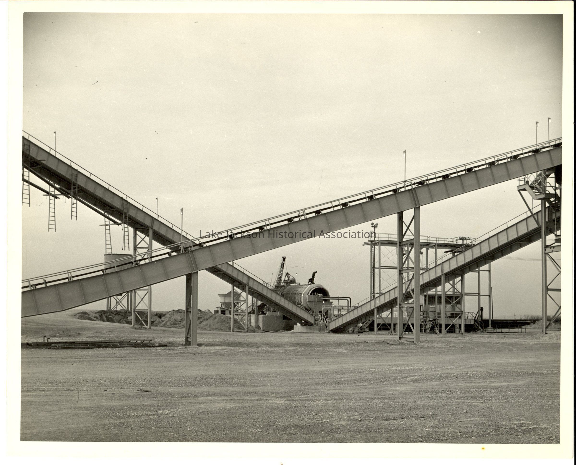 Black and white photo of the conveyors that took the oyster shells to the lime kiln. There are two men on top of a large piece of equipment in the background.Collection