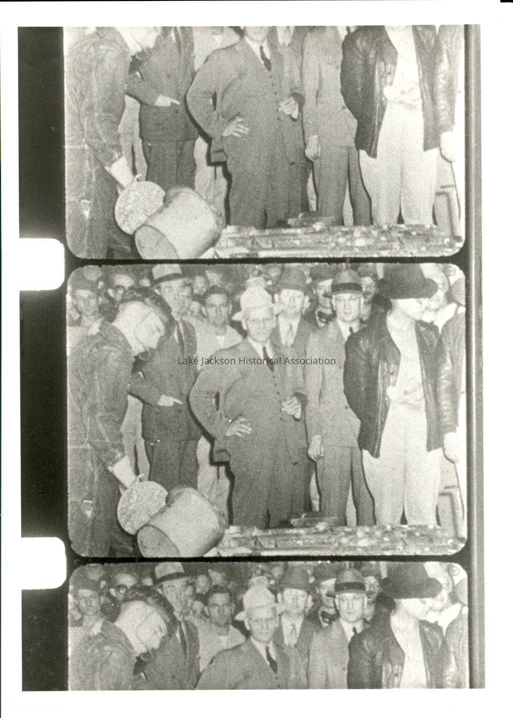 Black and white photo of the first magnesium metal poured on January 21, 1941. A.P. Beutel and a crowd of others watch.Collection