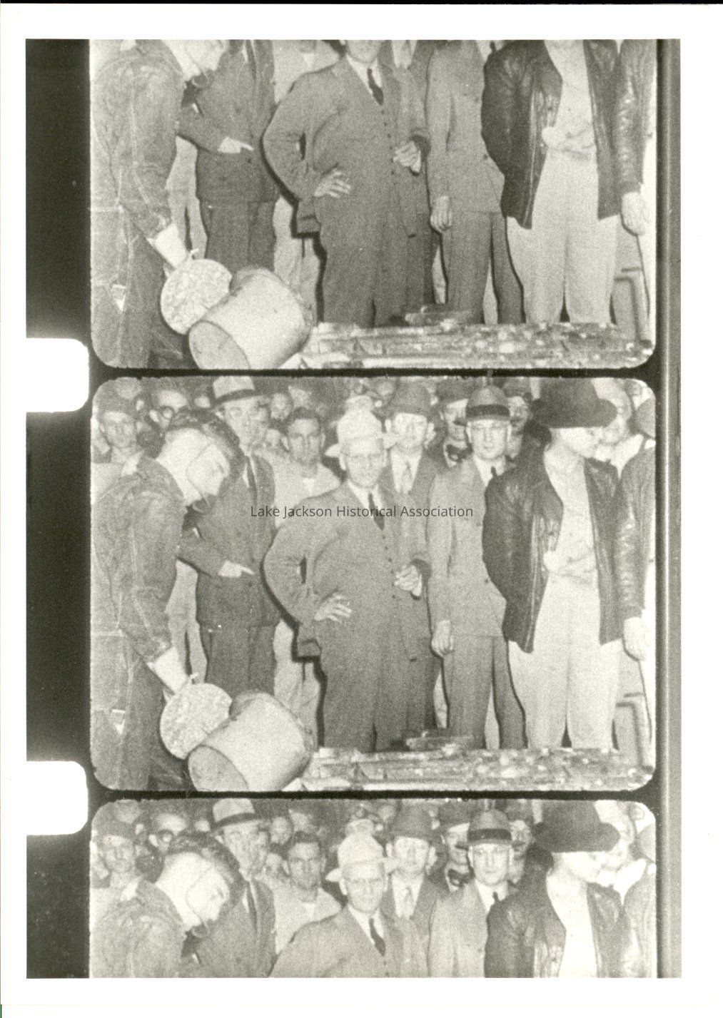 Black and white photo of the first magnesium metal poured on January 21, 1941. A.P. Beutel and a crowd of others watch.Collection