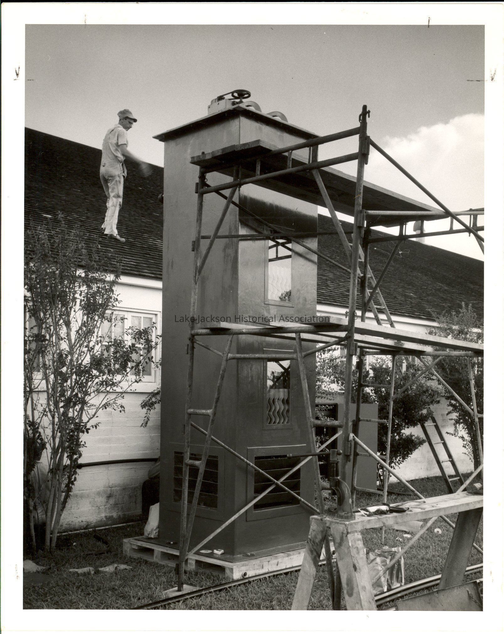 Black and white photo of a man on a roof, there is a large piece of equipment next to the building.Collection