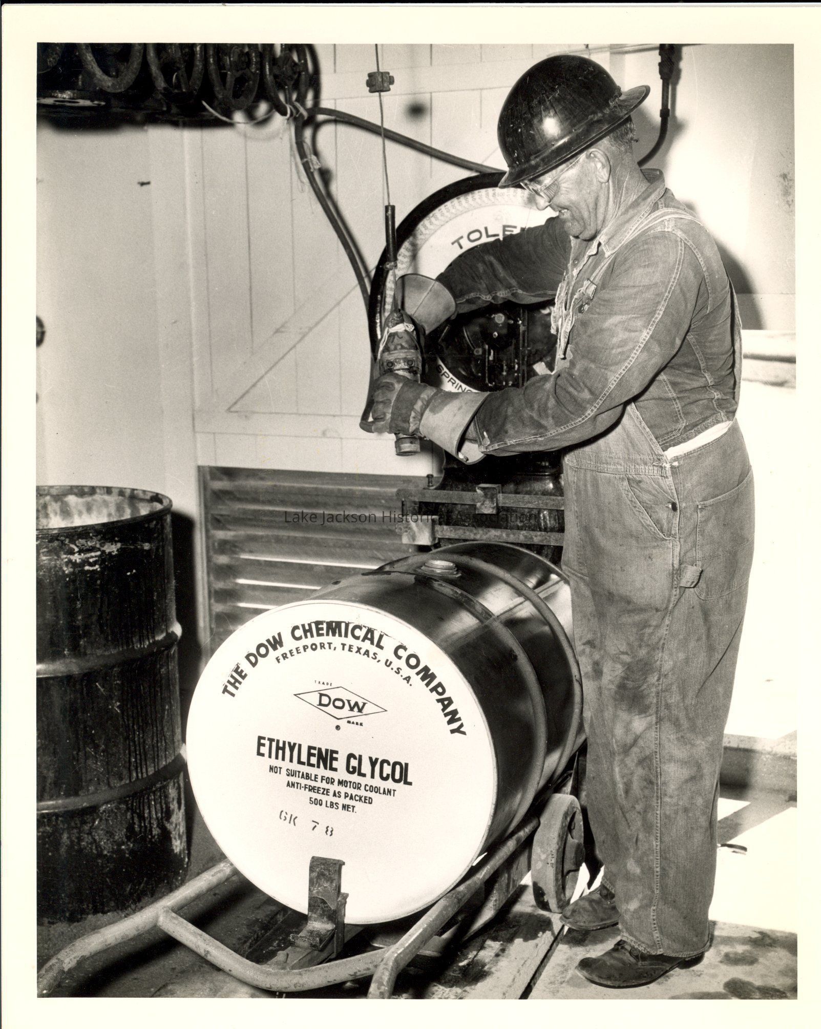 Black and white photo of a man working at the Dow Plant, he looks to be connecting something to a barrel that reads "Ethylene Glycol",Collection