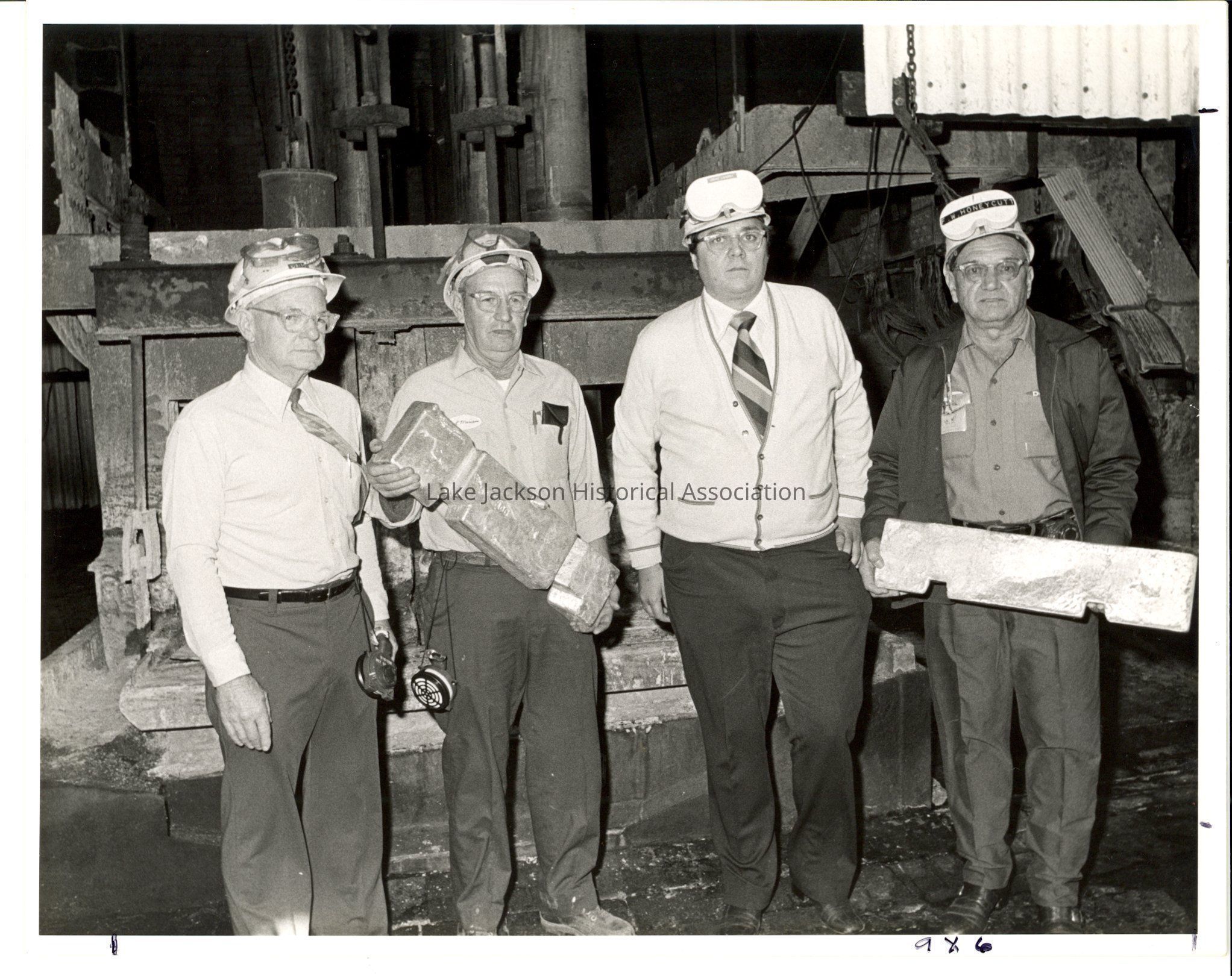 Black and white photo of four Dow employees (one with the name visible F.W. Honeycutt) with two magnesium ignots. Taken during magnesiums 30th birthday in the mid 1970s.Collection