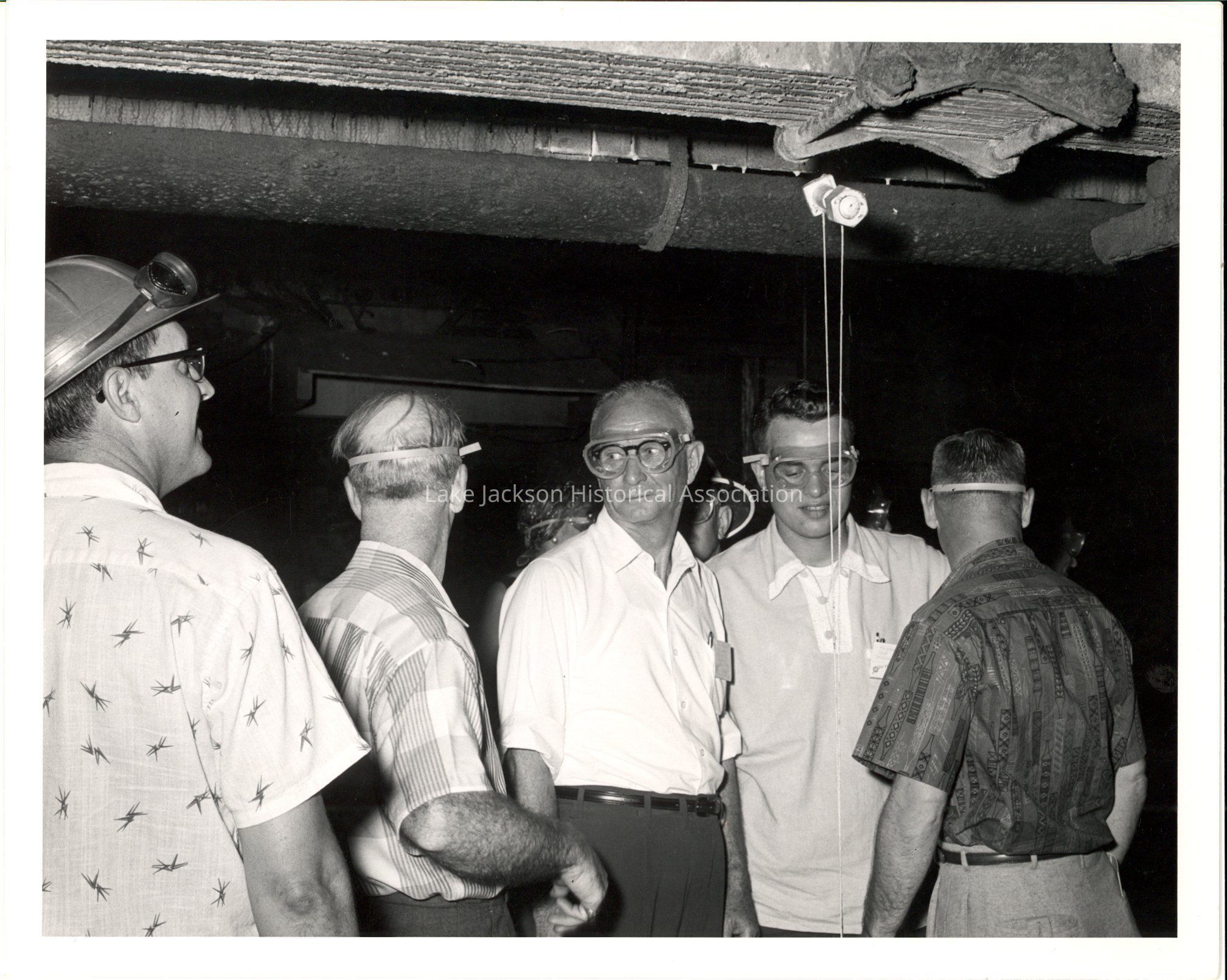 Black and white photo of a group of men and one woman in the background who look to be taking a tour of a section of the Dow plant.Collection