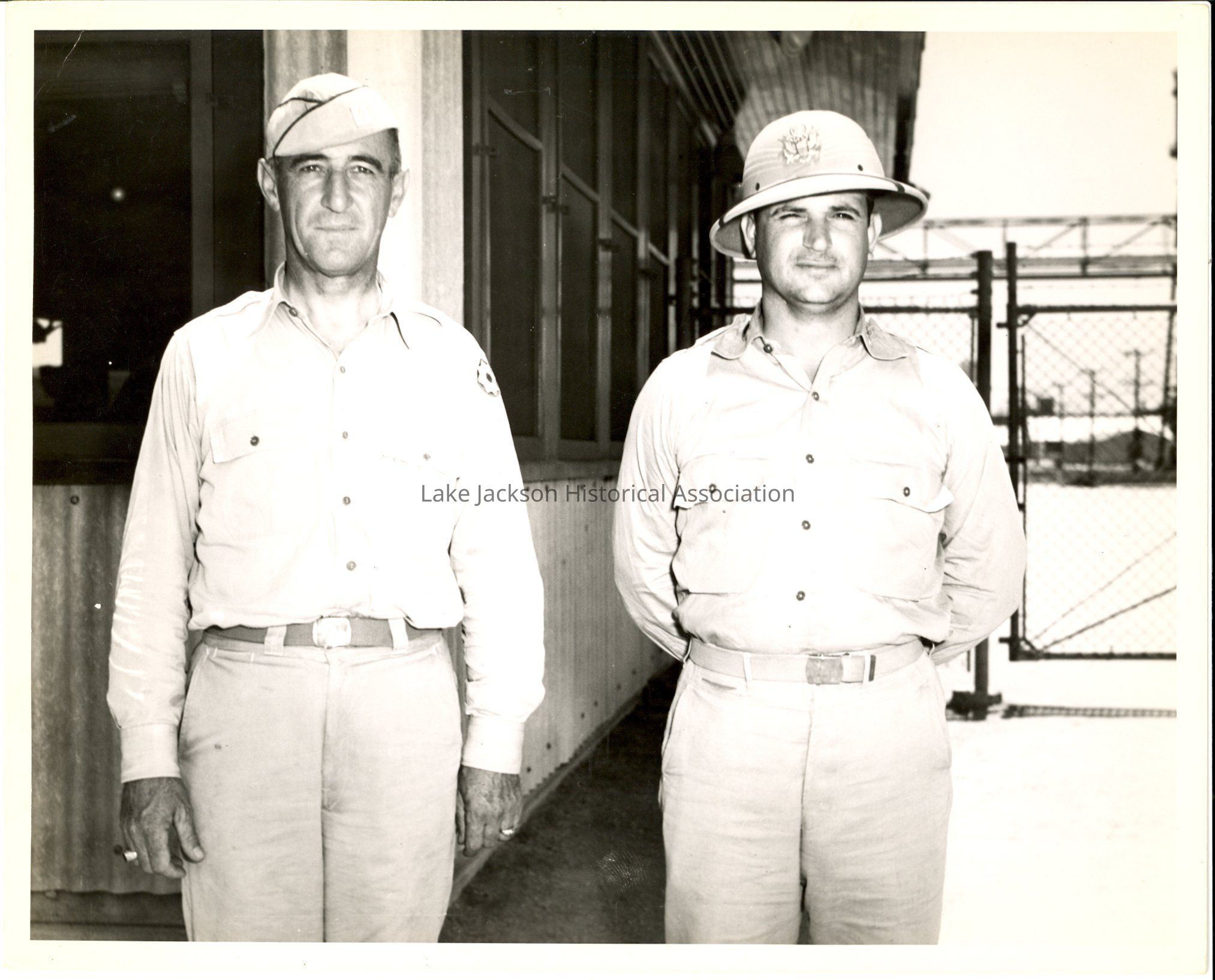 Black and white photo of two security guards as they stand at the gate in front of Dow entrance.Collection