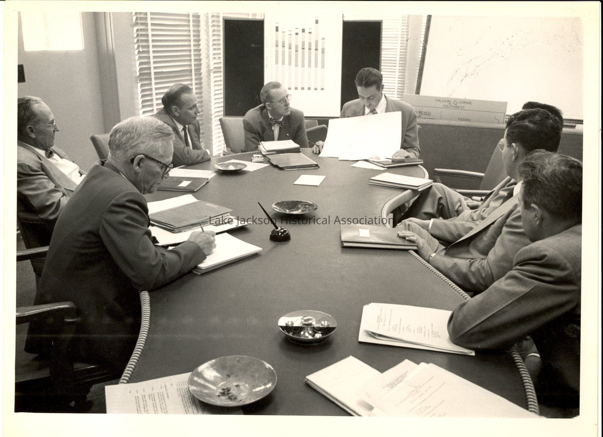 Black and white photo of A.P.Beutel, Griswwold, O. Beutel, CM Shigley, Earle Barnes, Roebke, W. Roeshe, and L. Evans as they sit at Beutels table in his office for a conference meeting. There are several ashtrays on the tables and charts in the background (one reads Calcium Fluoride)Collection