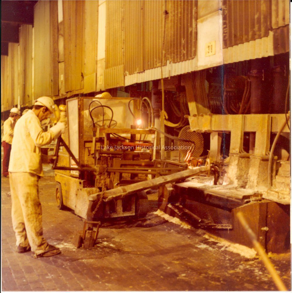Color photo of a worker working on a mag cell, on the back of the photo it reads" Mag before cells revamped with bus bars."Collection