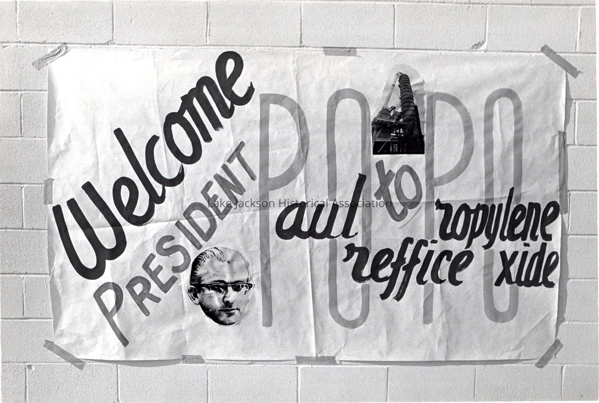 Black and white close-up photo of a sign on a wall welcoming President Paul Oreffice to the Proplene Oxide plant. He took a tour of the facility.Collection