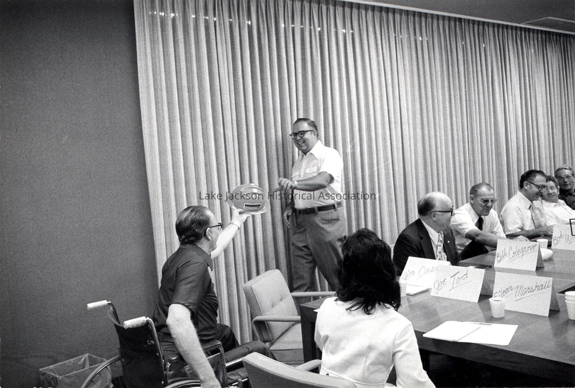 Black and white photo of Joe Tod handing a hardhat to someone to be given to President Paul Oreffice before his tour at the Proplene Oxide plant at Dow.Collection