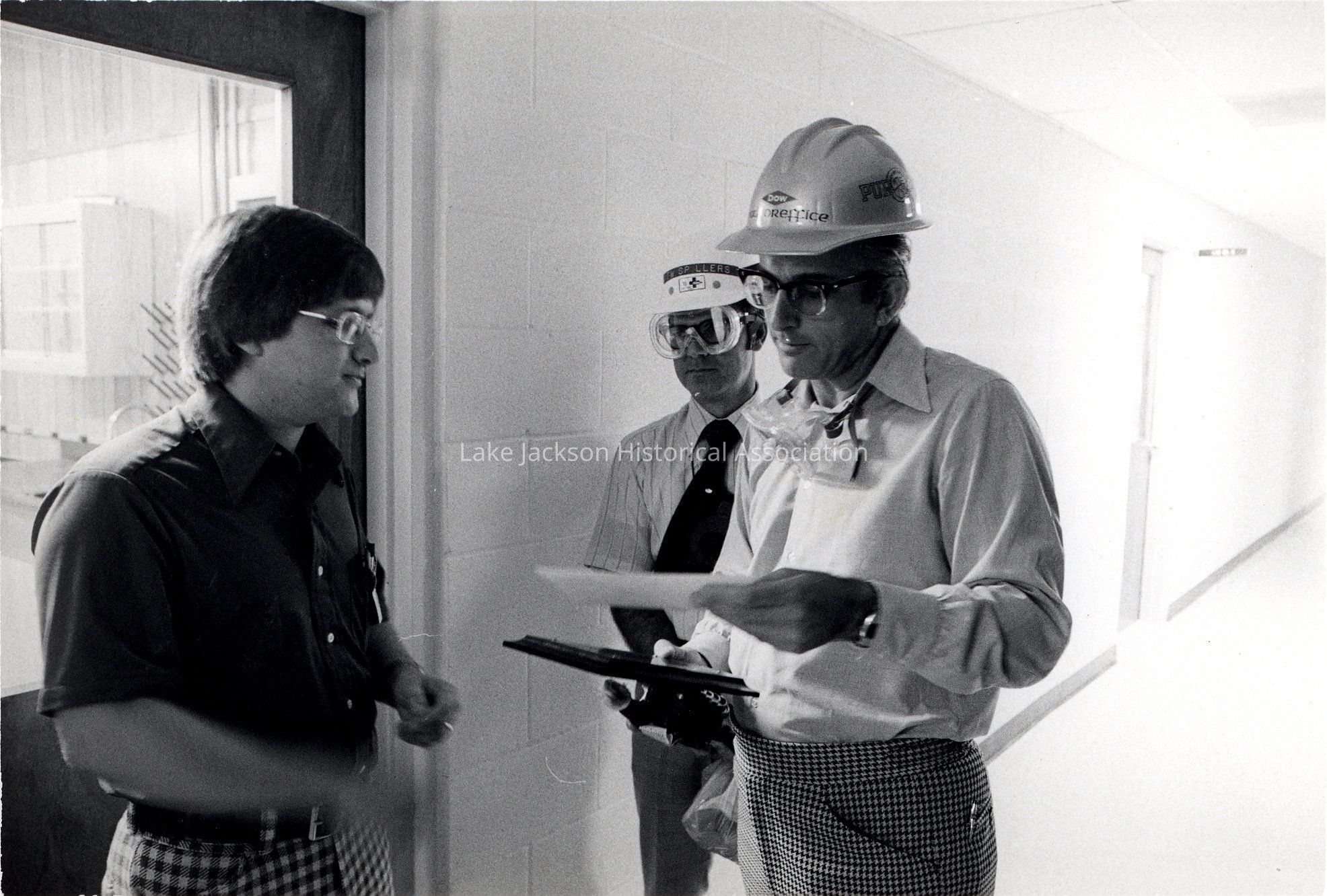 Black and white photo of President Paul Oreffice looking over some paper work with an employee while on his tour of the Proplene Oxide plant at Dow.Collection